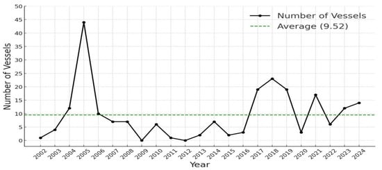 Figure 1 illustrates the changes in the number of IUU vessels from 2002, when RFMOs began registering IUU vessel lists, to 2024. Notable peaks are observed in 2004–2006 and 2017–2019. The increase in 2004–2006 is presumed to be due to a temporary surge in interest and the listing of vessels that had long been discussed in connection with IUU fishing during the initial stage of RFMO registrations. Since the 1990s, IUU fishing has received increasing attention at both the international and national levels, and the term “IUU fishing” was first officially used by the Commission for the Conservation of Antarctic Marine Living Resources (CCAMLR) in 1997 [18], supporting this explanation. The rise in 2017–2019 is likely attributable to a combination of policy and technological factors. During this period, the cross-listing system for IUU vessels was expanded among RFMOs, and monitoring capacity using vessel monitoring systems (VMS) was enhanced [19,20]. In addition, the FAO introduced the Global Record (GR) in 2017 to improve vessel identification capacity [21], which also contributed significantly. Over the entire period, the average number of IUU vessels registered annually from 2002 to 2024 was 9.52, with 12 vessels registered in 2023 and 14 in 2024, both above the average. These results indicate that while strengthening various policy and technological capabilities has aided in identifying vessels engaged in IUU fishing, IUU fishing itself has also become more sophisticated. Therefore, monitoring, control, and surveillance (MCS) technologies must continue to evolve.