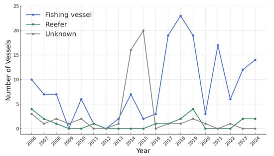 By vessel type, fishing vessels were the most prevalent (Figure 2), which is an expected result given that fishing vessels account for the largest share of the total fleet. An unusual finding is that in 2014–2015, there was a temporary increase in the number of unknown vessels; however, the improvement in vessel identification capabilities since 2017 is likely to have contributed to the subsequent decrease in unknown vessels. Although the trend for reefers shows little variation, considering that a single reefer can transport the catch from many fishing vessels, it is essential to enhance institutional and technological MCS capabilities for reefers in the same way as for fishing vessels.