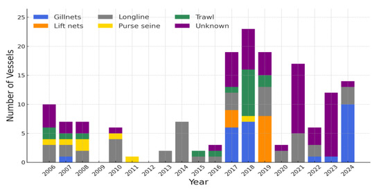 Figure 3 presents the classification of fishing gear types for vessels identified as fishing vessels in Figure 3. The increase observed in 2017–2019 is attributed to the same causes as the annual trend; therefore, this section focuses on changes in the composition by fishing gear type. According to Figure 3, since 2017, the ability to identify whether a vessel is a reefer or a fishing vessel appears to have improved; however, the capability to identify the fishing gear type of a fishing vessel does not seem to have advanced. The most reliable method for determining the fishing gear type of a vessel that is not flagged to the inspecting state is for an authorized inspector to physically identify the vessel at sea or in port. Information obtained through such inspections can be shared using the PSMA Global Record (GR) or the Global Information Exchange System (GIES); however, these methods are constrained by limited personnel and facilities as well as restricted access to information from non-member states. The next most commonly used approach is to utilize information registered in the Automatic Identification System (AIS). However, aside from positional data, vessel identification information in the AIS is self-reported and can be modified at any time, meaning it may be inaccurate or absent altogether. Ultimately, information managed by the flag state, such as that from VMS or electronic reporting (ER), is the most comprehensive and reliable.