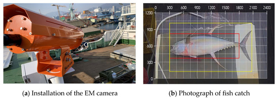 EM equipment installed on a Republic of Korea-flagged longliner: (a) camera installed in the wheelhouse; (b) recognition and photographic capture of the fish body, including body length and height (Source: Korea FMC).
