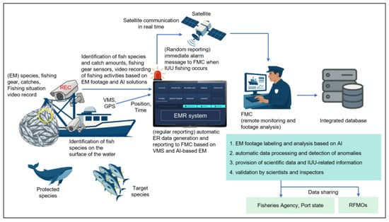 Securing the sustainability of fishery resources by preventing illegal, unreported, and unregulated (IUU) fishing is one of the major challenges facing the international community today [1]. According to one study, more than eight million to 14 million tons of unreported fish catches are traded illicitly every year, costing the legitimate market between USD 9 billion and USD 17 billion in trade each year [2]. Some scientists suggest that if current rates of depletion persist, most large predatory fish stocks will have collapsed by 2048 [3]. However, IUU fishing has not been eradicated. Since IUU vessels began to be officially listed by RFMOs in 2002, an average of 9.52 vessels have been registered annually, with 16 vessels listed in 2024 [4]. As the social and environmental consequences of IUU fishing become more apparent, the global community is making multifaceted efforts to curb indiscriminate overfishing and conserve fishery resources, with the goal of sustaining marine ecosystems [5]. The international community has incorporated IUU fishing regulations into various international instruments aimed at its eradication, including the 1982 United Nations Convention on the Law of the Sea (UNCLOS), the 1993 FAO Compliance Agreement, and the 1995 United Nations Fish Stock Agreement (UNFSA) [6]. The primary direct monitoring measures include the vessel monitoring system (VMS) and the deployment of observers on board fishing vessels. Placing observers on vessels to monitor fishing activities has inherent limitations [7]. To address these limitations, since the early 21st century, electronic monitoring (EM) has emerged as a cost-effective complement to traditional fisheries monitoring [8]. EM can enhance the traceability of distant water fishing, analyze monitoring footage to verify catch and catch per unit effort (CPUE), and assess compliance with regulations [9]. In particular, active discussions on EM standards are being led by the Western and Central Pacific Fisheries Commission (WCPFC) and the Inter-American Tropical Tuna Commission (IATTC) [10]. Digital traceability and transparency in global fisheries highlight the need for system architectures that integrate multiple data streams—such as EM, ER and VMS—into a unified platform [11]. EM also holds promise as a powerful future tool when integrated with existing data collection programs [12]. Moreover, while EM, ER, and data management systems can enable cost-efficient fisheries management, their successful implementation requires strategic program design, the use of artificial intelligence, and system integration [13]. Recent studies reveal that EM systems record up to three times more retained catch and detect unreported discards compared to vessel logbooks, highlighting the limits of self-reported data and the need for integrated monitoring to improve accuracy and transparency in fisheries management [14]. Accordingly, this study aims to examine the requirements for introducing electronic monitoring systems (EMS) as called for by the international community and to propose the I-EMR system—combining EM and electronic reporting systems (ERS) functionalities—as a systematic and advanced monitoring framework.