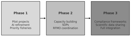 In Phase 3, the system advances toward full-scale deployment. It is embedded into national and RFMO compliance frameworks, while data-sharing protocols are established to support scientific research.