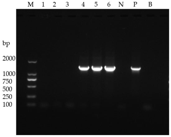 WSSV detection in samples. M: marker; 1–3: healthy shrimp; 4–6: diseased shrimp; N: negative control; P: positive control.