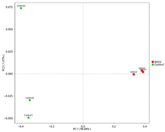 Following the methodology described by Cornejo-Granados et al. [], the moribund diseased shrimp (n = 90, body length: 6–7 cm) in the late stages of WSSV infection [] were obtained from a pond with stocking density of 30,000 individuals, salinity of 27, and water temperature of 27~28 °C located at an aquaculture farm in Shandong Province, China. The healthy cultured shrimp (n = 90, body length: 6–7 cm) without disease signs of WSSV infection were obtained from another pond from the same aquaculture farm with the same stocking density, salinity, and water temperature. Both healthy and WSSV-infected shrimp surfaces were sterilized with 75% ethanol followed by aseptic collection of complete intestinal tissues, which were dissected and divided into 3 biological replicates, randomly labeled as Control 1–3 (healthy, n = 30) and WSSV 1–3 (infected, n = 30), and preserved in sterile tubes. All samples were flash-frozen in liquid nitrogen and stored at −80 °C within 24 h for downstream analysis. Gills and hepatopancreas were aseptically collected and labeled as 1–3 (healthy shrimp) and 4–6 (WSSV-infected) for WSSV detection.