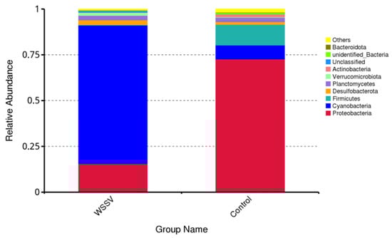 The species abundance of the intestinal microbiota in the WSSV-infected and control groups was annotated and analyzed at the phylum level (Figure 6, Table 4). More than 10 phyla were identified in both groups, including Cyanobacteria, Proteobacteria, Firmicutes, Desulfobacterota, Planctomycetes, Verrucomicrobiota, and Actinobacteria. A stacked bar chart illustrates the relative abundance of these phyla. In the control group, the dominant phyla were Proteobacteria (72.68%) and Firmicutes (11.27%). Conversely, the WSSV-infected group was dominated by Cyanobacteria (75.51%) and Proteobacteria (15.63%). Notably, the abundance of Cyanobacteria increased significantly (p < 0.05), while the abundance of Proteobacteria decreased significantly (p < 0.05) in the WSSV-infected group compared to the control group (Figure 7, Table 5).