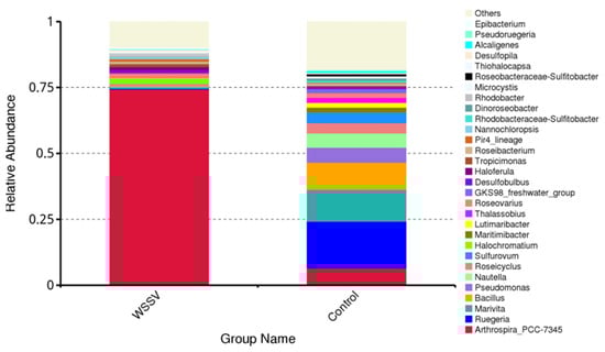 Relative abundance of intestinal microbiota in WSSV-infected and control P. monodon at the genus level.