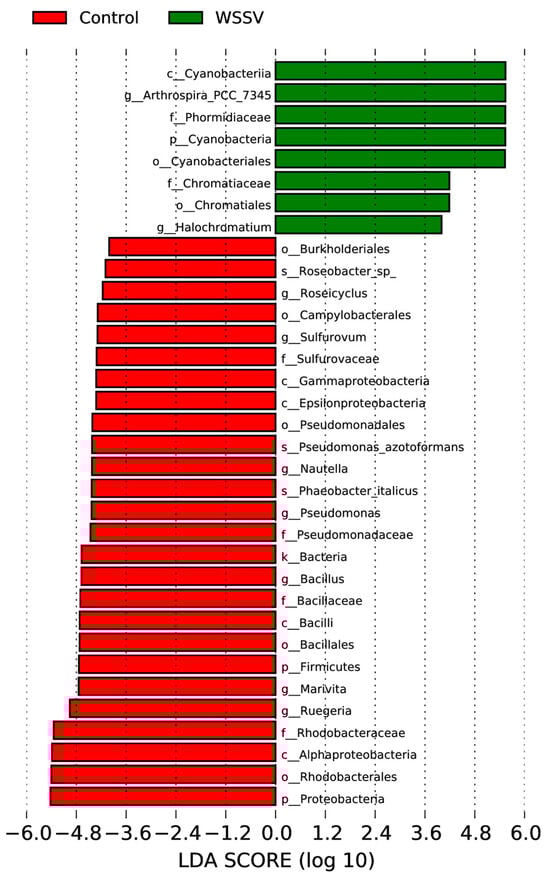 At the genus level, the composition and abundance of the dominant bacteria differed markedly between the two groups. A total of 306 bacterial genera were identified (Figure 7). In the WSSV-infected group, the dominant genera were Arthrospira_PCC-7345 (74.32%), Halochromatium (1.98%), and Roseovarius (1.56%). In contrast, the control group was dominated by Ruegeria (17.67%), Marivita (12.08%), and Bacillus (10.30%). To further explore the intestinal microbiota associated with WSSV infection in P. monodon, an LEfSe (Linear Discriminant Analysis Effect Size) analysis was conducted to compare the relative abundance of microbial taxa between the WSSV-infected and control groups. This analysis identified the taxa that exhibited significant differences. A linear discriminant analysis (LDA) and cladograms revealed that two generas (Arthrospira and Halochromatium), two families (Chromatiaceae and Phormidiaceae), two orders (Cyanobacteriales and Chromatiales), and one phylum (Cyanobacteria) were significantly higher in the WSSV-infected group (p < 0.05) (Figure 8 and Figure 9).