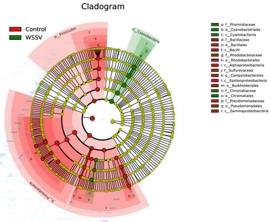 In contrast, the control group exhibited a significantly greater relative abundance of microbial taxa across multiple taxonomic levels compared to the WSSV-infected group (p < 0.05). Notably, the control group showed a greater abundance in seven genera, four families, five orders, and two phyla. These results highlight the pronounced alterations in the intestinal microbiota composition associated with WSSV infection, underscoring the potential involvement of specific microbial taxa in disease progression and the host’s immune response.