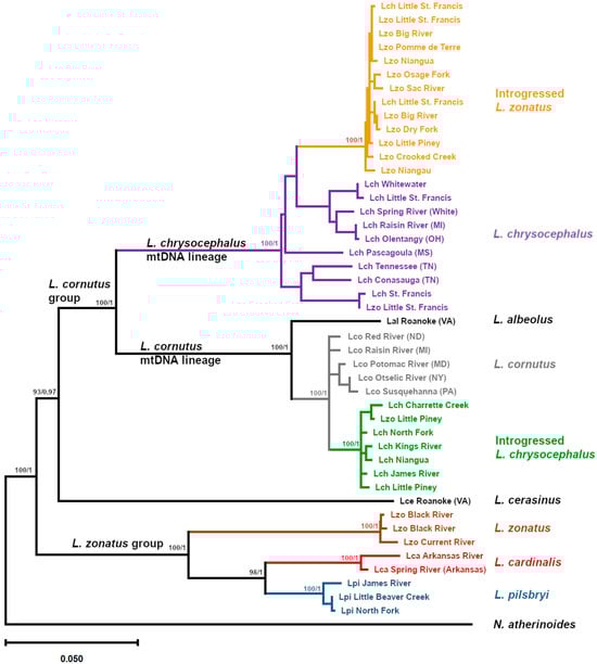 Hybridization is common in fishes [], and particularly prevalent in minnows and shiners of the family Leuciscidae [,,]. Multi-species unguarded nesting behaviors are common among minnows and shiners [] and are associated with high rates of hybridization []. Discordant mitonuclear introgression patterns have been extensively reported among fish species, with examples of complete mitogenome replacement at the population level reported in salmonids [,,], cichlids [], darters [], killifishes [,,], and shiners in the genus Luxilus [].