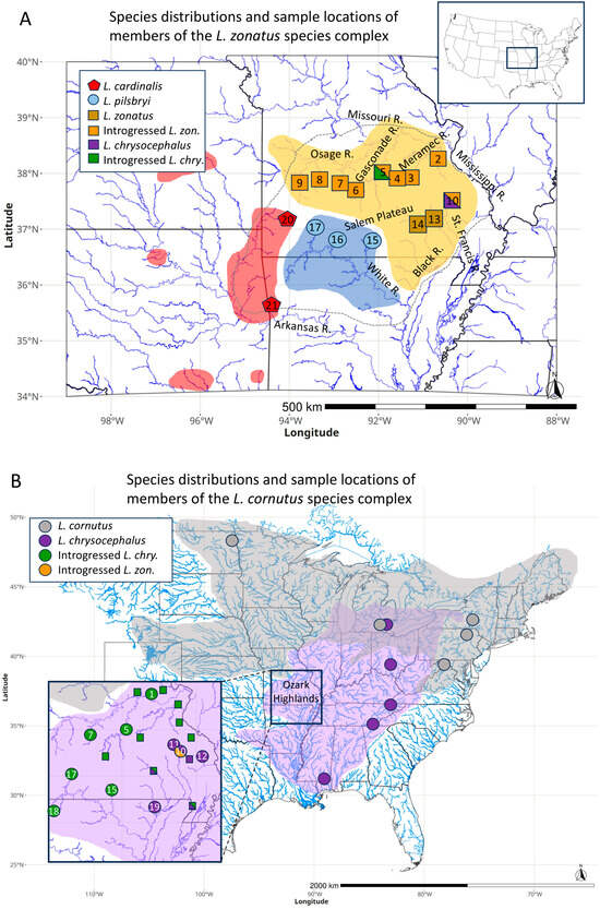 Distribution of species and mitochondrial linages for morphologically assigned members of the (A) L. zonatus group and (B) L. cornutus group. Shaded areas delineate species distributions, and symbols with colors indicate mitochondrial lineages. Split symbols indicate sample mitochondrial polymorphism. Numbered sample locations are identified according to Table 1. The dotted line in (A) marks the boundary of the Ozark Interior Highlands. Small square symbols in (B) reproduce data first reported in Ref. []. Mitochondrial lineage colors match clades in Figure 1.