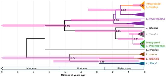 Our Bayesian phylogenetic analysis yielded the same tree topology as the ML analysis, with the exception that there was weak evidence for reciprocal monophyly between L. cornutus and introgressed L. chrysocephalus sequences (Figure 3). This calibrated phylogeny exhibited very large HPD confidence intervals in part due to calibration uncertainty built into the analysis. Nevertheless, confidence intervals placed the coalescent ages of most clades of interest within the Pleistocene (2.6 to 0.01 Ma). Our analysis placed the most likely age of the most recent shared ancestor between L. cornutus and L. chrysocephalus as pre-Pleistocene, at 5.05 Ma (0.61–11.77 Ma), and the L. zonatus group (L. zonatus, L. pilsbryi, L. cardinalis) at 4.75 Ma (0.59–11.07) (Figure 3). The coalescent age of all samples in the L. chrysocephalus mtDNA lineage was 1.98 Ma (0.24–4.62 Ma), and the introgressed L. zonatus clade within the L. chrysocephalus mtDNA lineage was 0.30 Ma (0.03–0.72 Ma). Nucleotide divergence (Dxy) between the introgressed L. zonatus clade and the next most closely related L. chrysocephalus haplotype was 0.049 with an estimated age of 1.52 Ma (0.16–3.57 Ma). The age of the ancestor of the L. cornutus and introgressed L. chrysocephalus mtDNA lineage (i.e., excluding L. albeolus) was 0.73 Ma (0.07–1.72 Ma), with an age for the nested range-wide L. cornutus clade estimated at 0.42 Ma (0.04–1.02 Ma), and the introgressed L. chrysocephalus clade estimated at 0.31 Ma (0.03–0.74 Ma), respectively.
