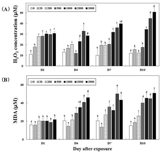 Changes in the H2O2 concentration (A) and malondialdehyde (MDA) content (B) in the hepatopancreas of H. discus hannai subjected to the following experimental exposure: 0, 20, 200, 500, 1000, 2000, or 3000 mg/L of bentonite clay for 10 d. Different lowercase letters indicate significant differences between different concentrations within the same exposure day (p < 0.05). All values are means ± standard error (SE; n = 3).