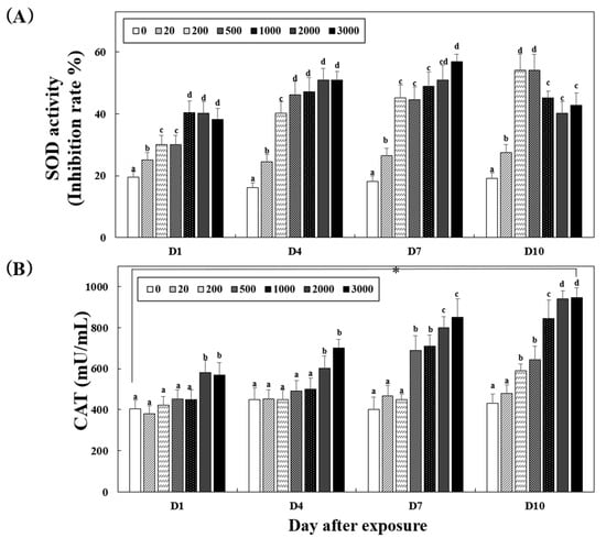 Changes in the superoxide dismutase (SOD) (A) and catalase (CAT) (B) activities in the hepatopancreas of Haliotis discus hannai subjected to the following experimental exposure: 0, 20, 200, 500, 1000, 2000, or 3000 mg/L of bentonite clay for 10 d. Different lowercase letters indicate significant differences between different concentrations within the same exposure day (p < 0.05). Asterisk (*) indicate the significant interaction between time and concentration (p < 0.05). All values are means ± standard error (SE; n = 3).