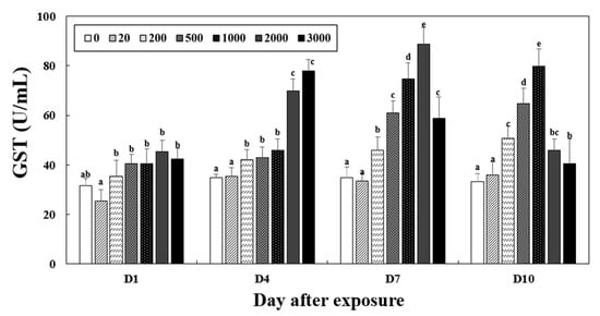Changes in the glutathione-S-transferase (GST) activity in the hepatopancreas of Haliotis discus hannai subjected to the following experimental exposure: 0, 20, 200, 500, 1000, 2000, or 3000 mg/L of bentonite clay for 10 d. Different lowercase letters indicate significant differences between different concentrations within the same exposure day (p < 0.05). All values are means ± standard error (SE; n = 3).
