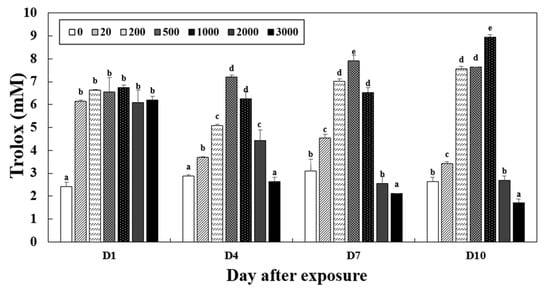 Changes in the Trolox equivalent antioxidant capacity in the hepatopancreas of Haliotis discus hannai subjected to the following experimental exposure: 0, 20, 200, 500, 1000, 2000, or 3000 mg/L of bentonite clay for 10 d. Different lowercase letters indicate significant differences between different concentrations within the same exposure day (p < 0.05). All values are means ± standard error (SE; n = 3).