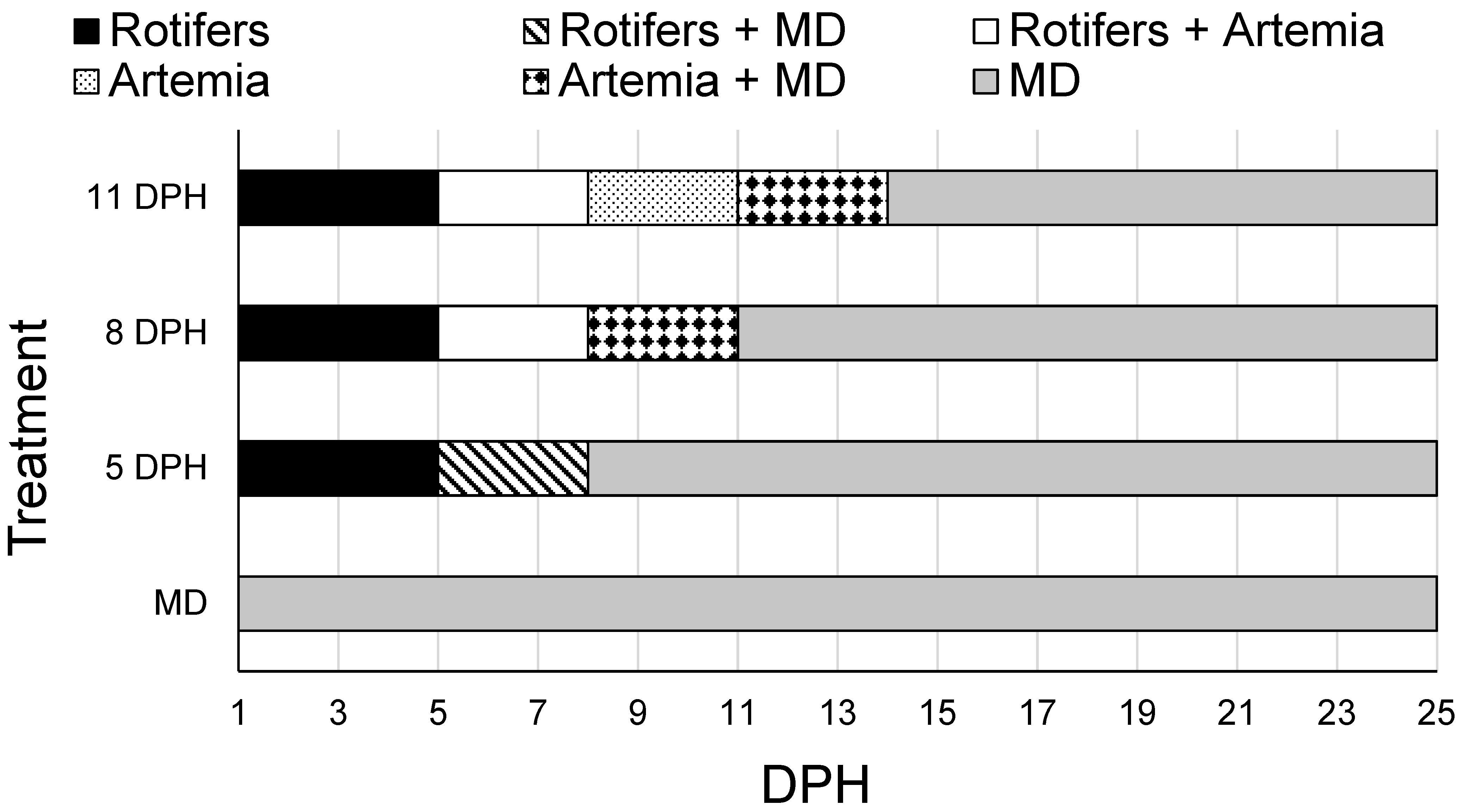 A. ocellaris, the present study tested the introduction of MD at 1, 5, 7, and 11 DPH to determine the earliest timepoint at which this species could be weaned from live feeds to an inert diet.