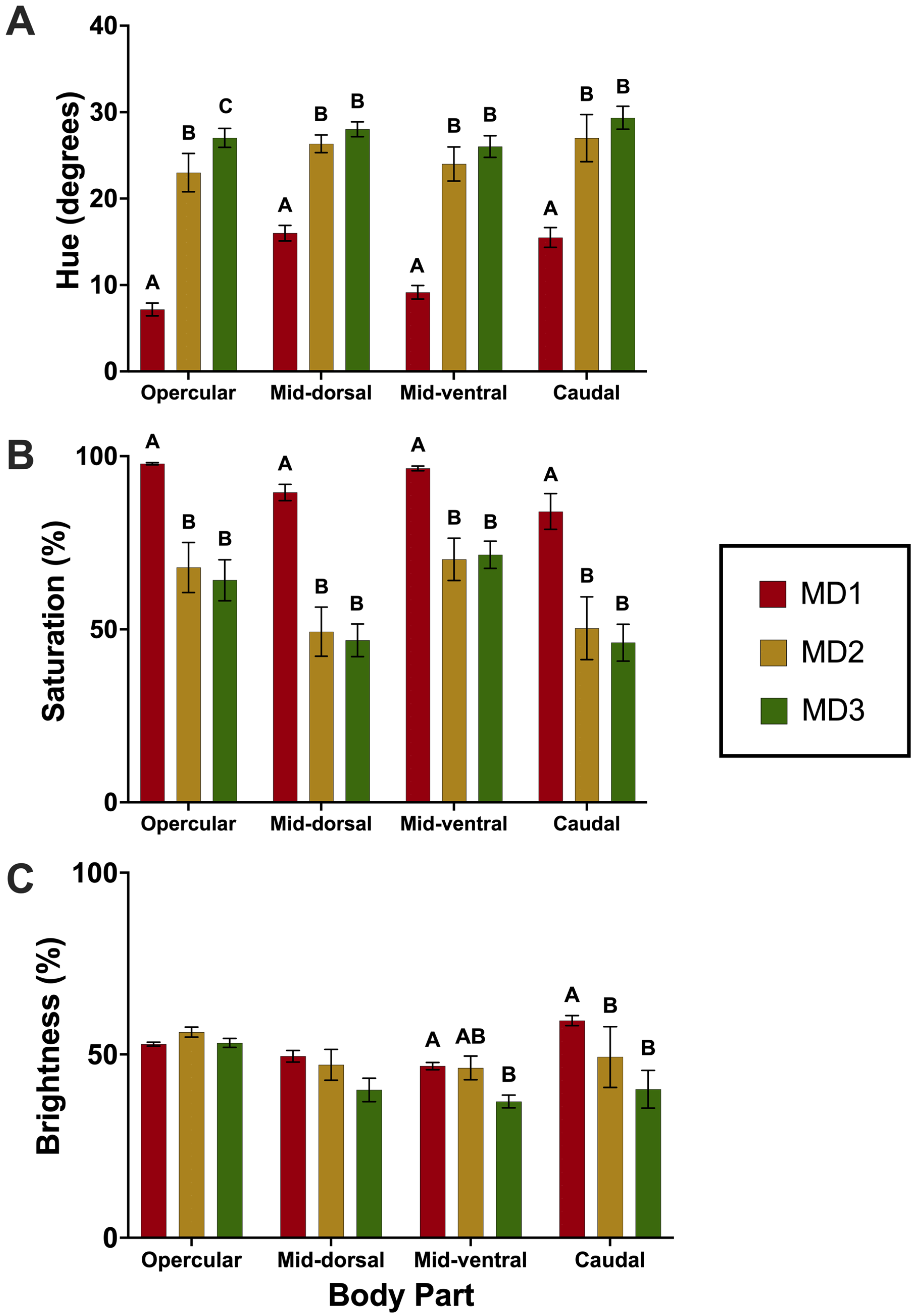 Clownfish, survival and growth was not affected by MD brand in the dietetics trial, suggesting that each MD satisfied the nutritional requirements of clownfish larvae. However, clownfish fed a diet of TDO ChromaBoost™ exhibited more red-shifted hue values and significantly higher color saturation; therefore, TDO ChromaBoost™ produced