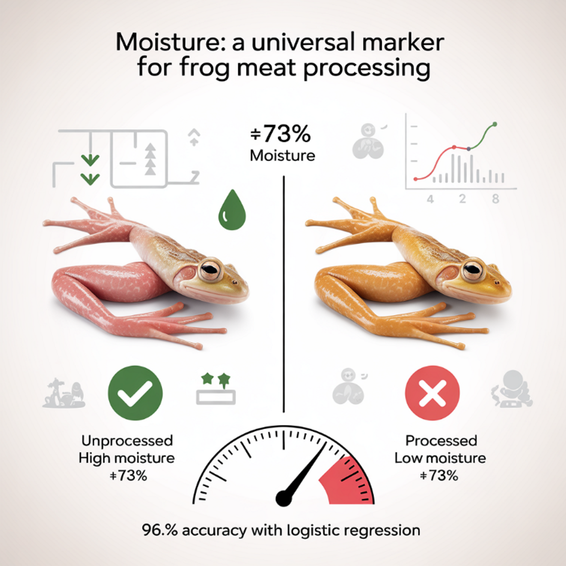 Our analysis of 34 data entries from 10 species demonstrates that species, geographical origin, and especially processing significantly influence the proximate composition of frog leg meat. Our findings underscore that the value of an analytical method is defined not solely by its complexity but by the rigor of its validation and the practicality of its application. While sophisticated techniques like isotopic analysis or genomics exist for mainstream meats, niche sectors like amphibian-derived products often lack such tailored, cost-effective solutions. By rigorously calibrating and validating a model based on a single, simple proximate parameter—moisture—we elevate it from a basic descriptive metric to a powerful quantitative index for processing authentication. This demonstrates that universally available, simple analyses can be successfully deployed as highly effective first-line screening tools, filling a critical gap in quality control. The major contribution of this work is therefore not the introduction of a new analytical technique, but the novel application and robust statistical validation of an existing, simple one to solve a specific and previously unaddressed problem in food authenticity, providing an immediately implementable strategy for industry and regulators.