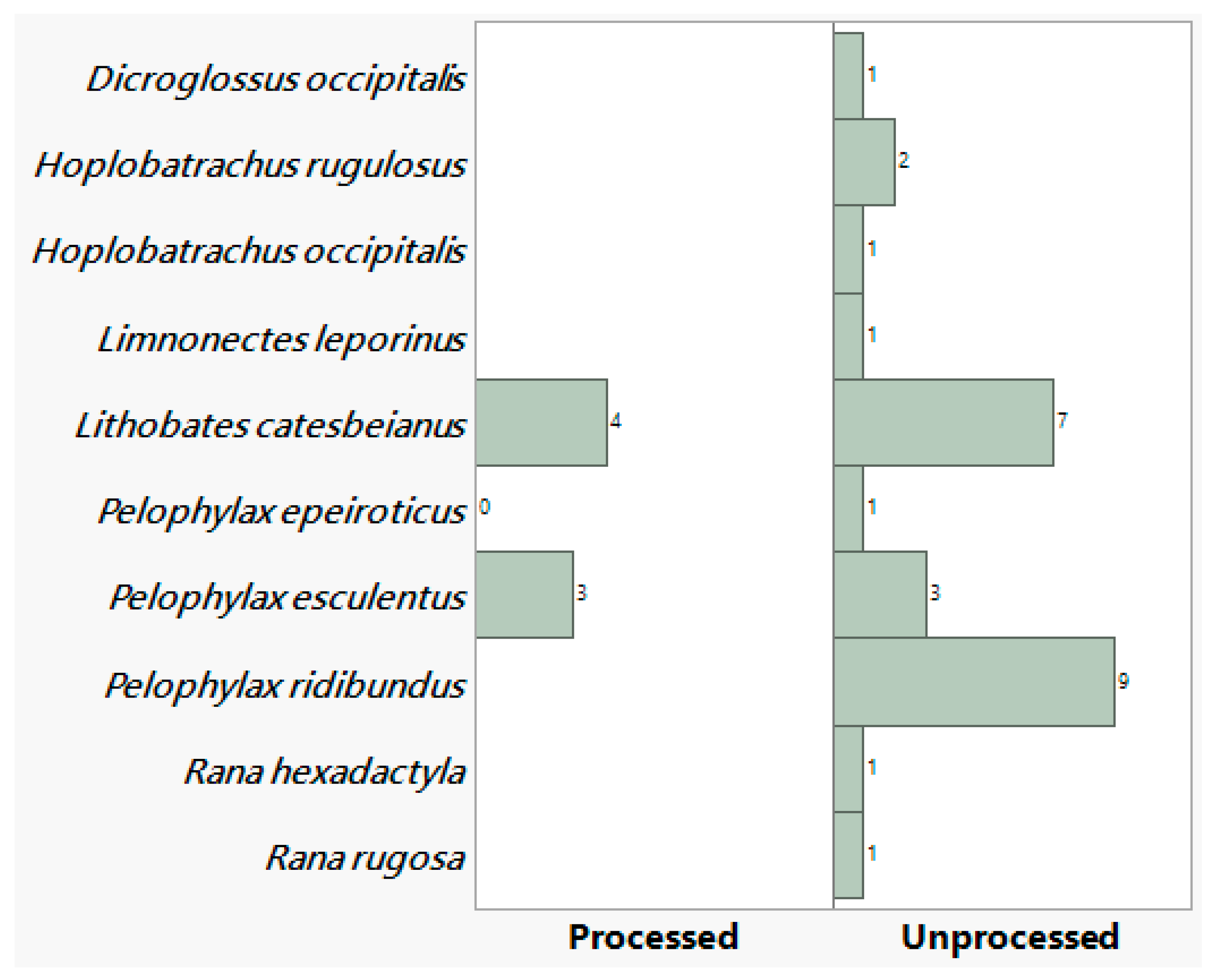 In total 34 data entries were collected with 10 species recorded. Most of the entries comprised unprocessed (27 entries, 79.4%) and fewer (7 entries, 20.59%) of processed frog leg meat (