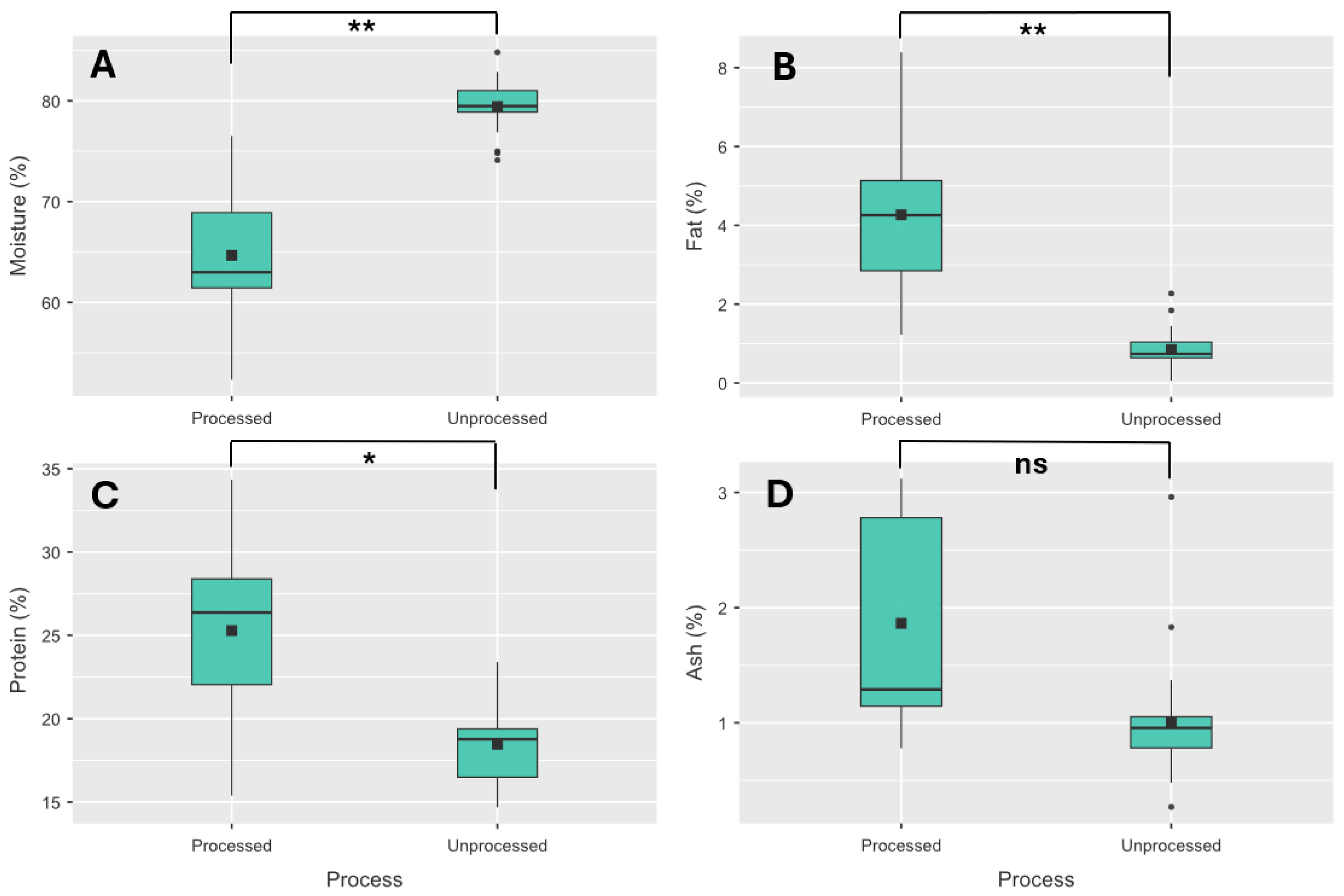 Figure 3). With moisture content of processed frog leg meat being significantly higher for unprocessed meat with the opposite occurring for fat, protein and ash content, with the ash not significantly different.