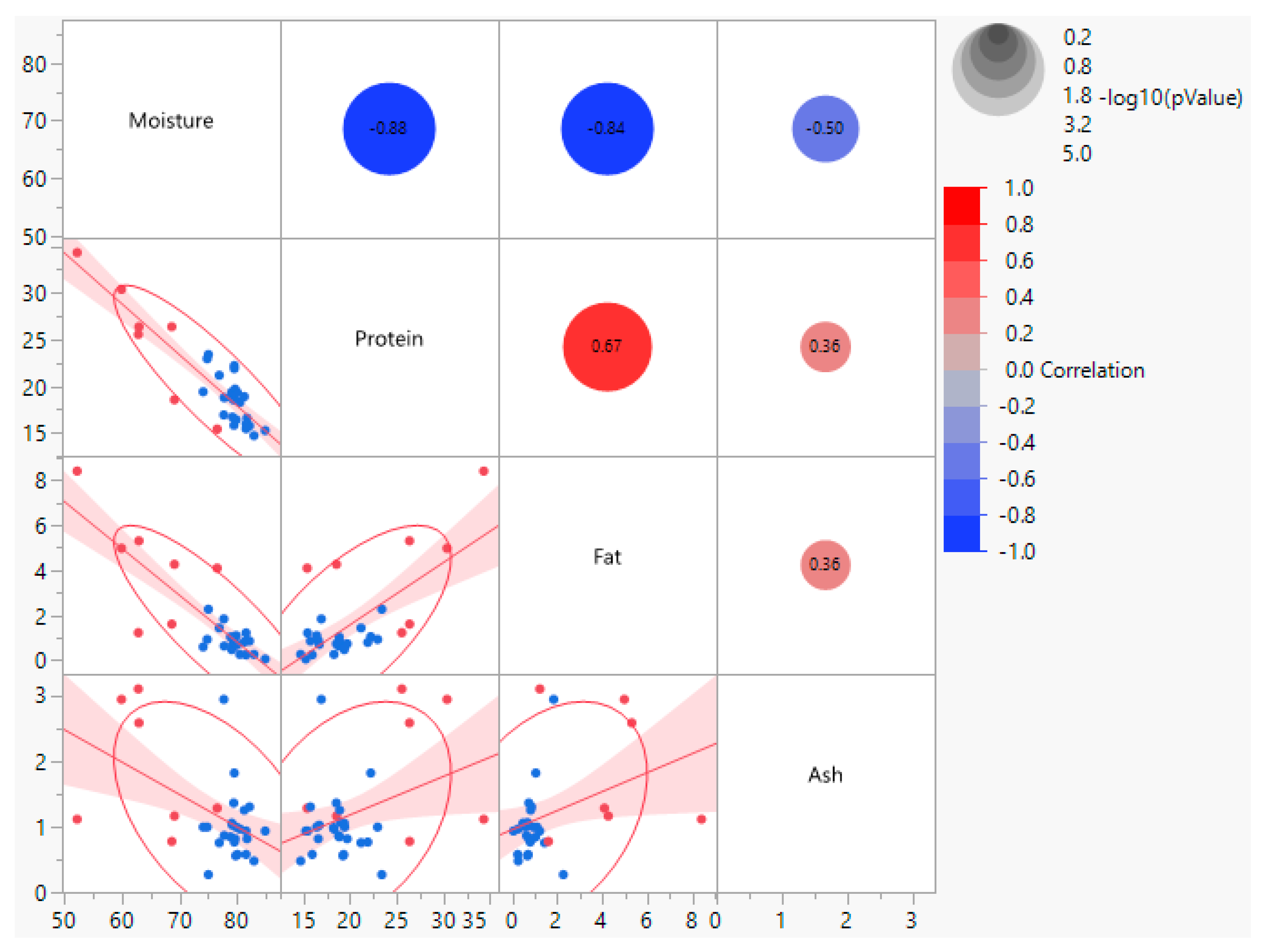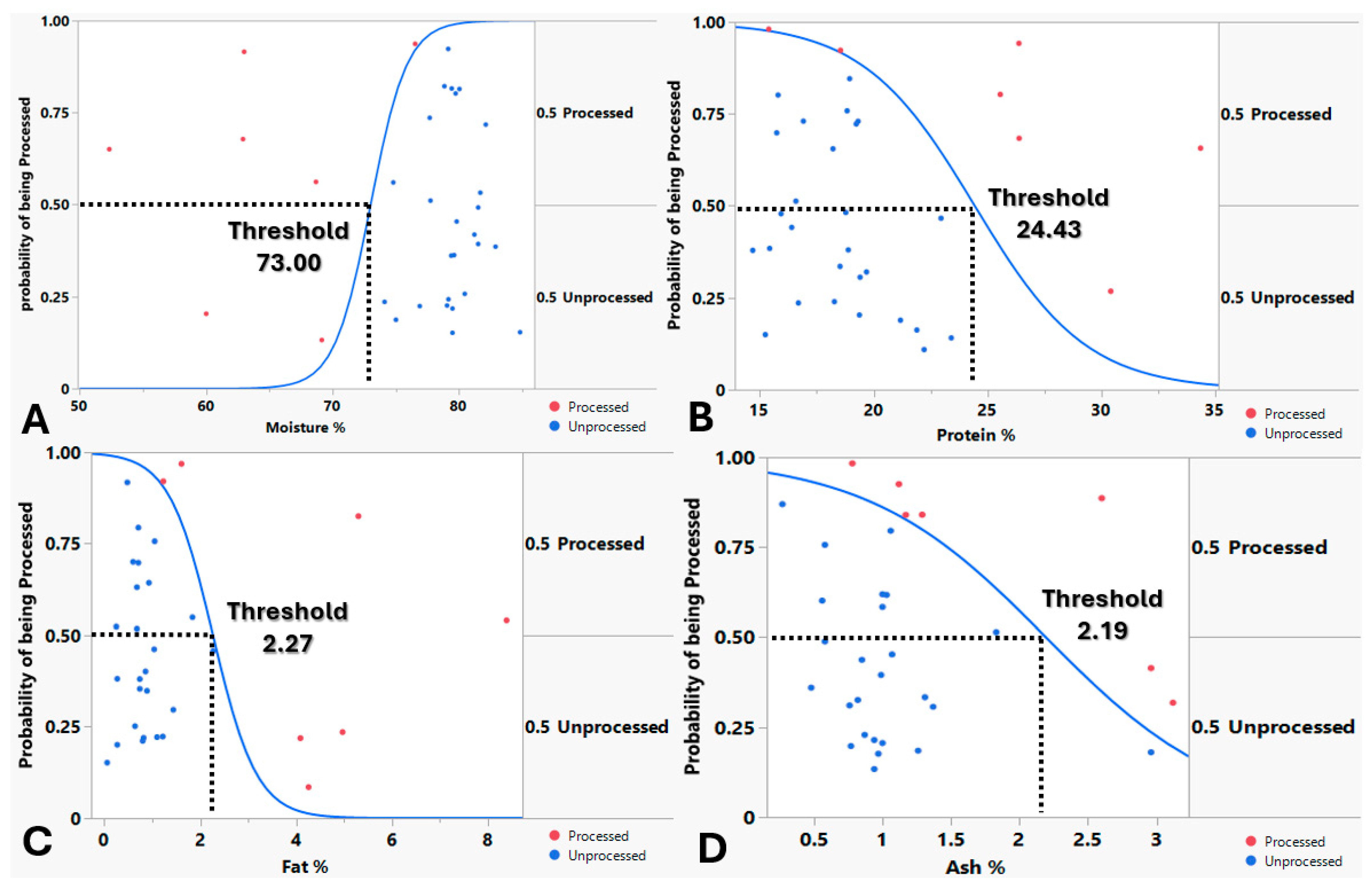 Figure 4). Nominal logistic regression models showed that above 73% moisture, below 24.43% protein, below 2.27% fat and below 2.19% ash, there is higher probability (more than 50%) for the frog leg meat being processed (