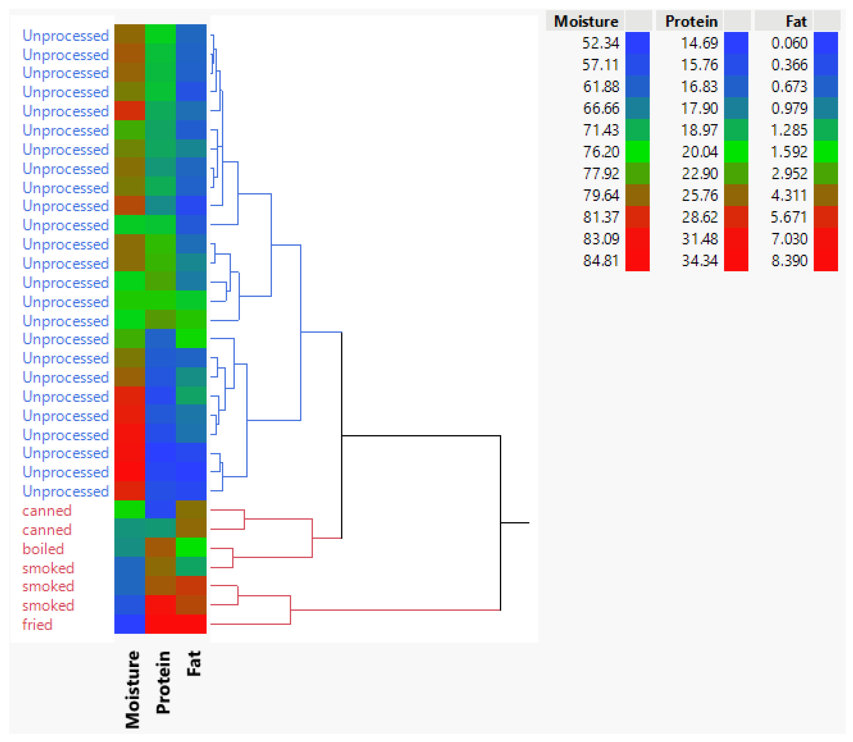 Figure 5 presents a heatmap with hierarchical clustering (Ward method) to visualize patterns in standardized macronutrient values (moisture, fat, and protein) that significantly differ between processed and unprocessed frog leg meat. The analysis reveals two distinct clusters, clearly separating processed and unprocessed samples, underscoring the pronounced impact of processing on nutrient composition. Values range from 0.060 to 8.390, with the heatmap’s color gradient and dendrogram highlighting systematic differences in macronutrient profiles. This clear segregation demonstrates that processing markedly alters moisture, fat, and protein content, providing a quantitative basis for understanding its effects on nutritional quality. Hierarchical clustering further reinforces these findings by grouping samples with similar characteristics, enhancing interpretability.