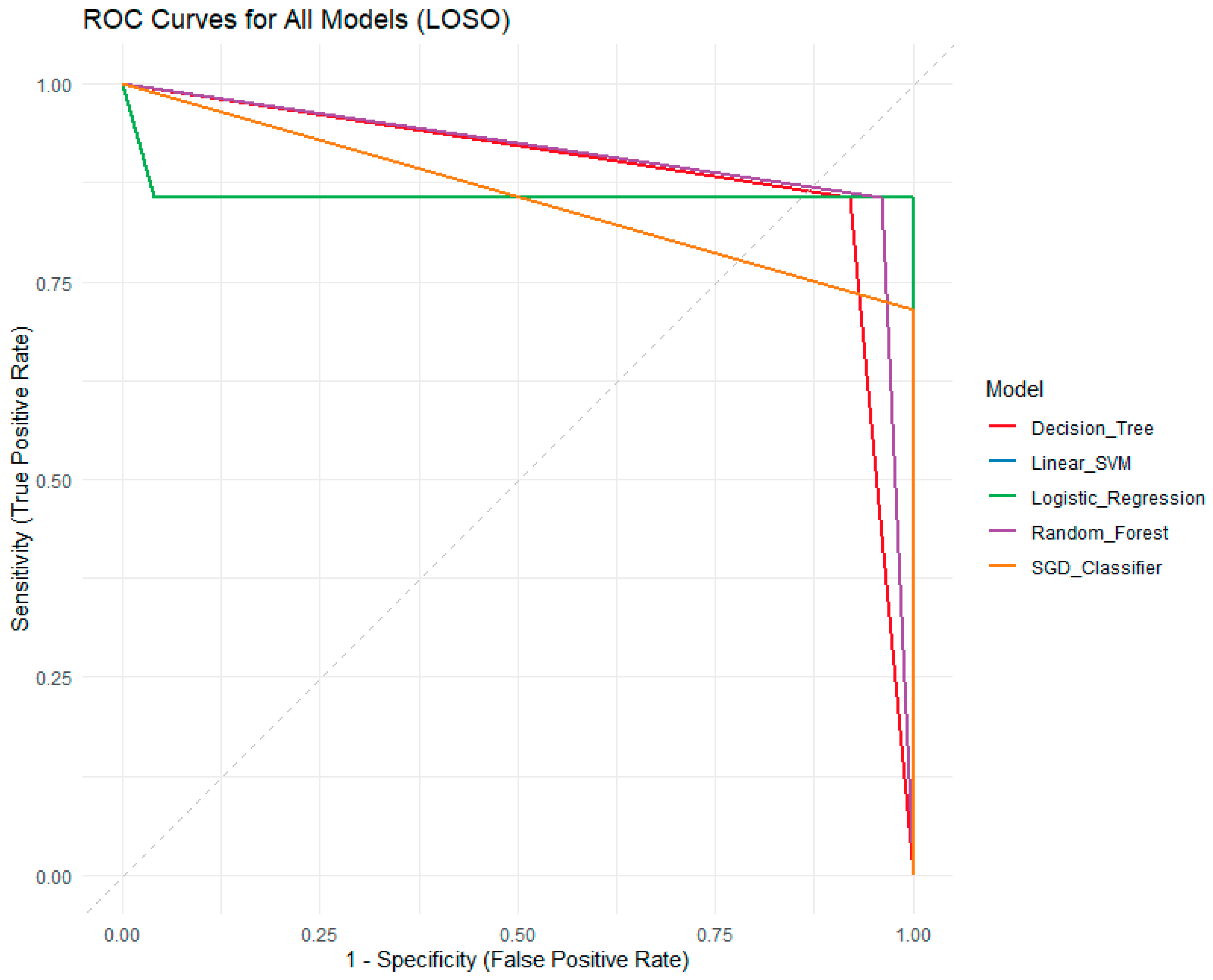 Figure 7) the True Positive Rate (Sensitivity) against the False Positive Rate (1—Specificity) across all possible decision thresholds. The area under the ROC curve (AUC) provides a threshold-independent measure of a model’s ability to discriminate between processed and unprocessed frog leg meat. An AUC of 0.5 indicates no discrimination (random guessing), while an AUC of 1.0 represents perfect discrimination. In this analysis, the Linear SVM and Random Forest models exhibit the highest AUC values (0.908), indicating excellent overall discriminative power. The Logistic Regression model shows a strong AUC of 0.860. The SGD Classifier and Decision Tree also perform well, with AUCs of 0.857 and 0.888, respectively. The near-vertical drop of the Logistic Regression curve at high specificity demonstrates its exceptional ability to avoid false positives, which is critical for regulatory applications where incorrectly labeling unprocessed meat as processed is highly detrimental.