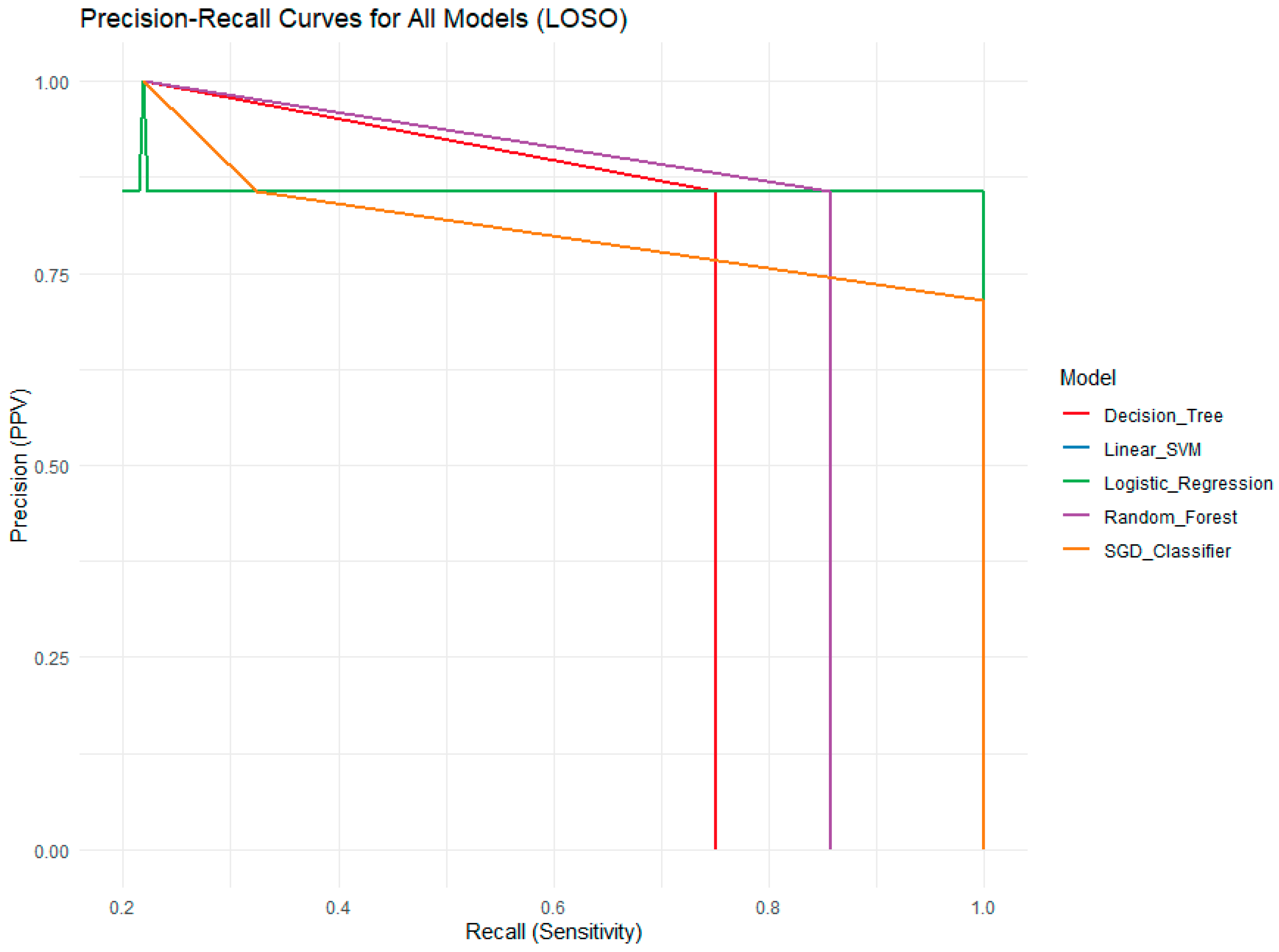 Figure 8). This metric is particularly informative for imbalanced datasets, such as this one, where unprocessed samples are significantly more common than processed ones (25 vs. 7). Precision measures the proportion of true positive predictions among all positive predictions, reflecting the model’s exactness. Recall measures the proportion of true positives correctly identified among all actual positives, reflecting the model’s completeness. The PR curve is more sensitive than the ROC curve to differences in the minority class (processed samples). Here, the Logistic Regression model maintains a high precision (PPV) of 1.0 across a wide range of recall values, confirming its perfect precision. The Linear SVM and Random Forest models show similar performance, achieving a balance between precision and recall. The SGD Classifier exhibits high precision but lower recall, indicating it is conservative and misses some processed samples. The Decision Tree has the lowest precision at higher recall levels, meaning that when it predicts “processed,” it is less reliable.