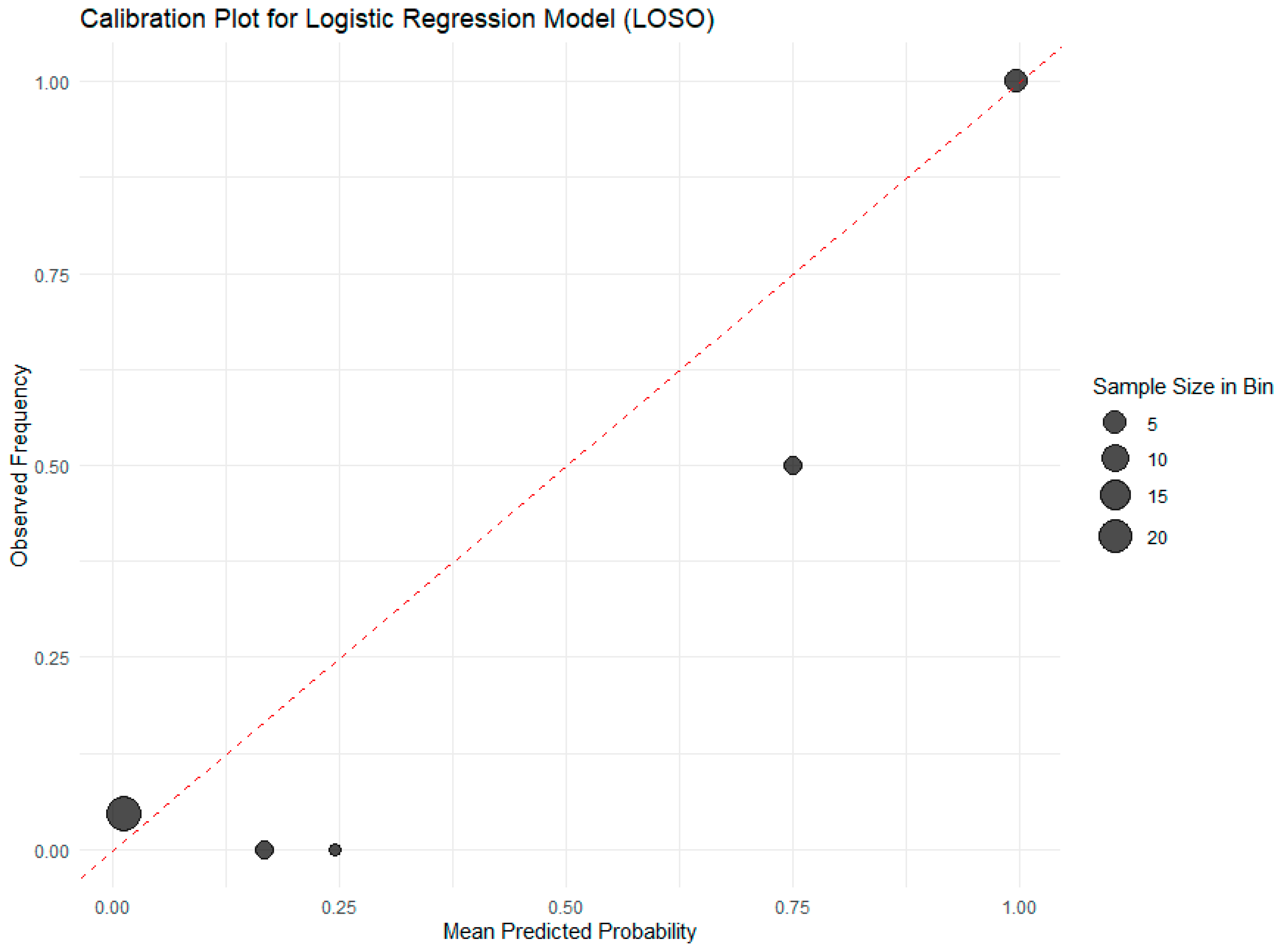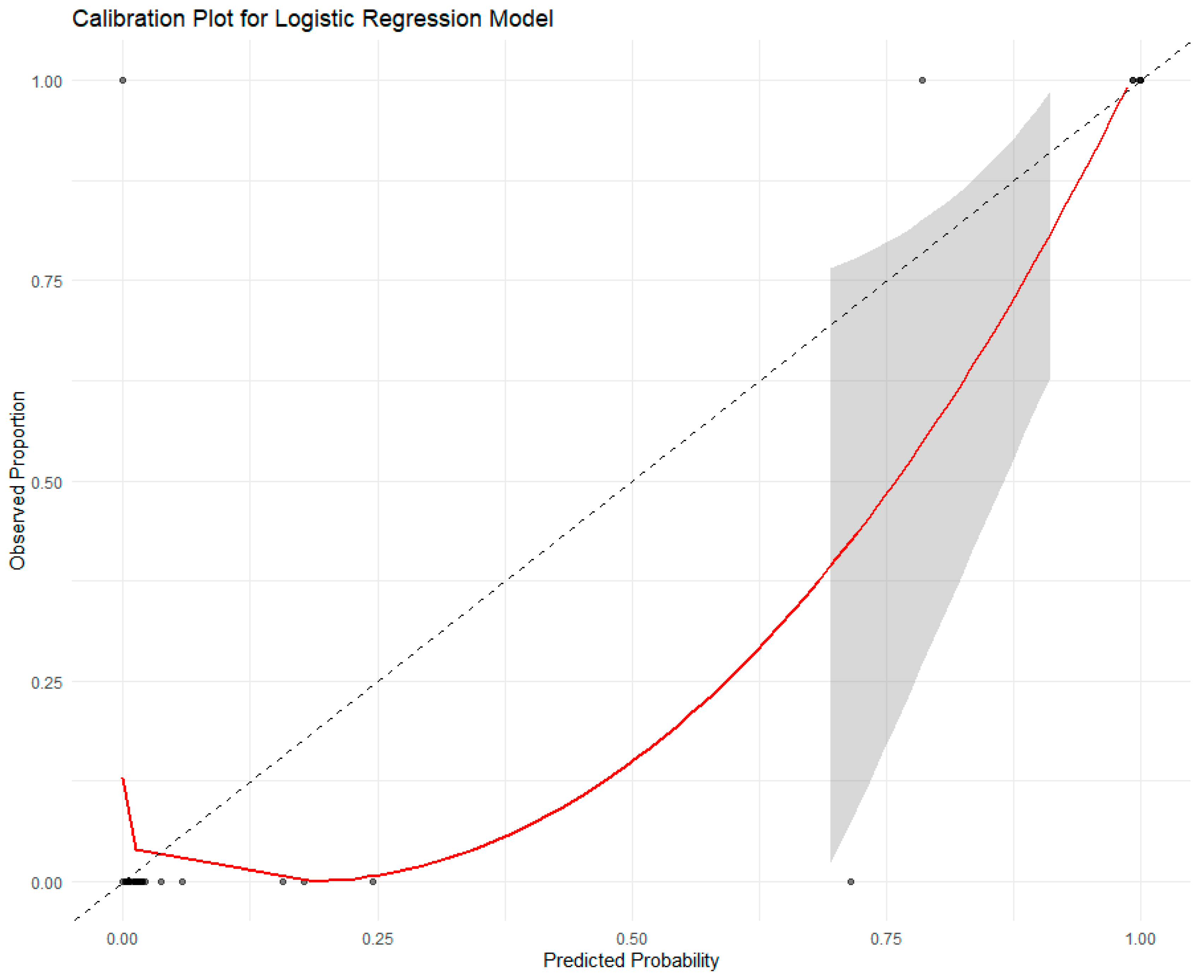 The logistic regression model demonstrated very good calibration. The Brier score was 0.045, indicating a very high agreement between predictions and outcomes. The calibration slope was 1.02 and the intercept was −0.08, confirming that the model’s probability estimates were highly reliable without evidence of overfitting or underfitting (