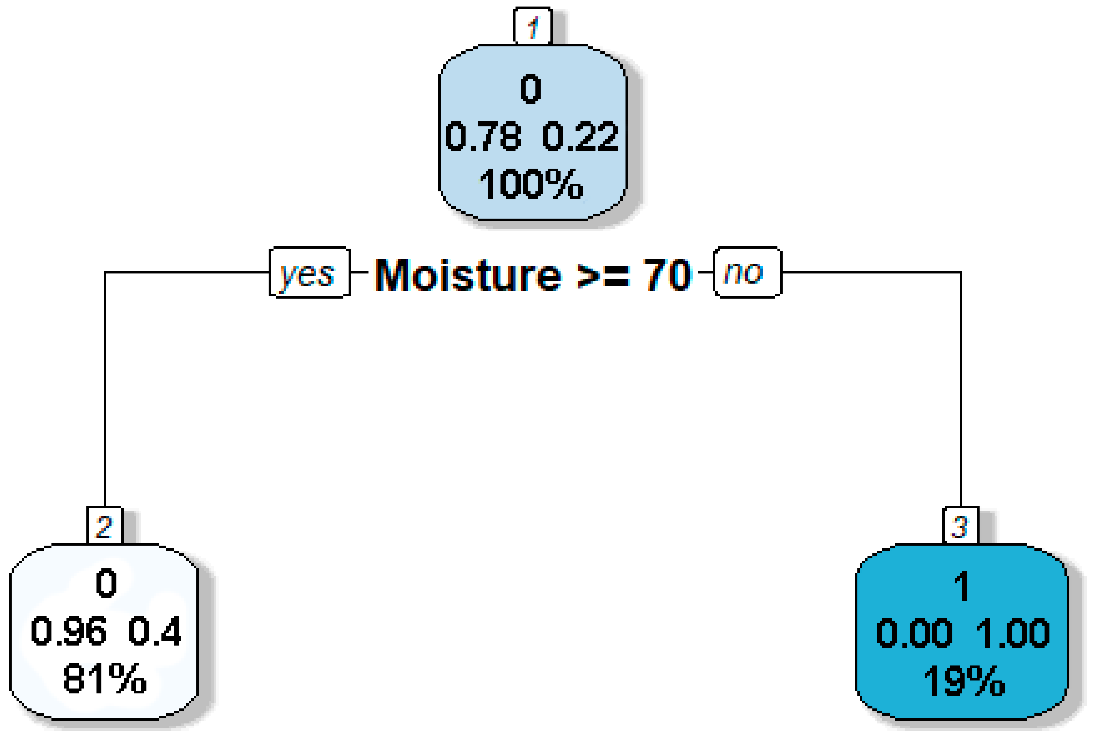 Samples with moisture content below 70% were predominantly classified as unprocessed into one category (96% accuracy), representing 81% of the dataset, while those at or above this threshold are exclusively classified as processed (100% accuracy), comprising the remaining 19% of the dataset. This simple yet powerful binary rule demonstrated that moisture content serves as a primary and sufficient predictor for processing classification, achieving good discriminative performance with a single decision node.