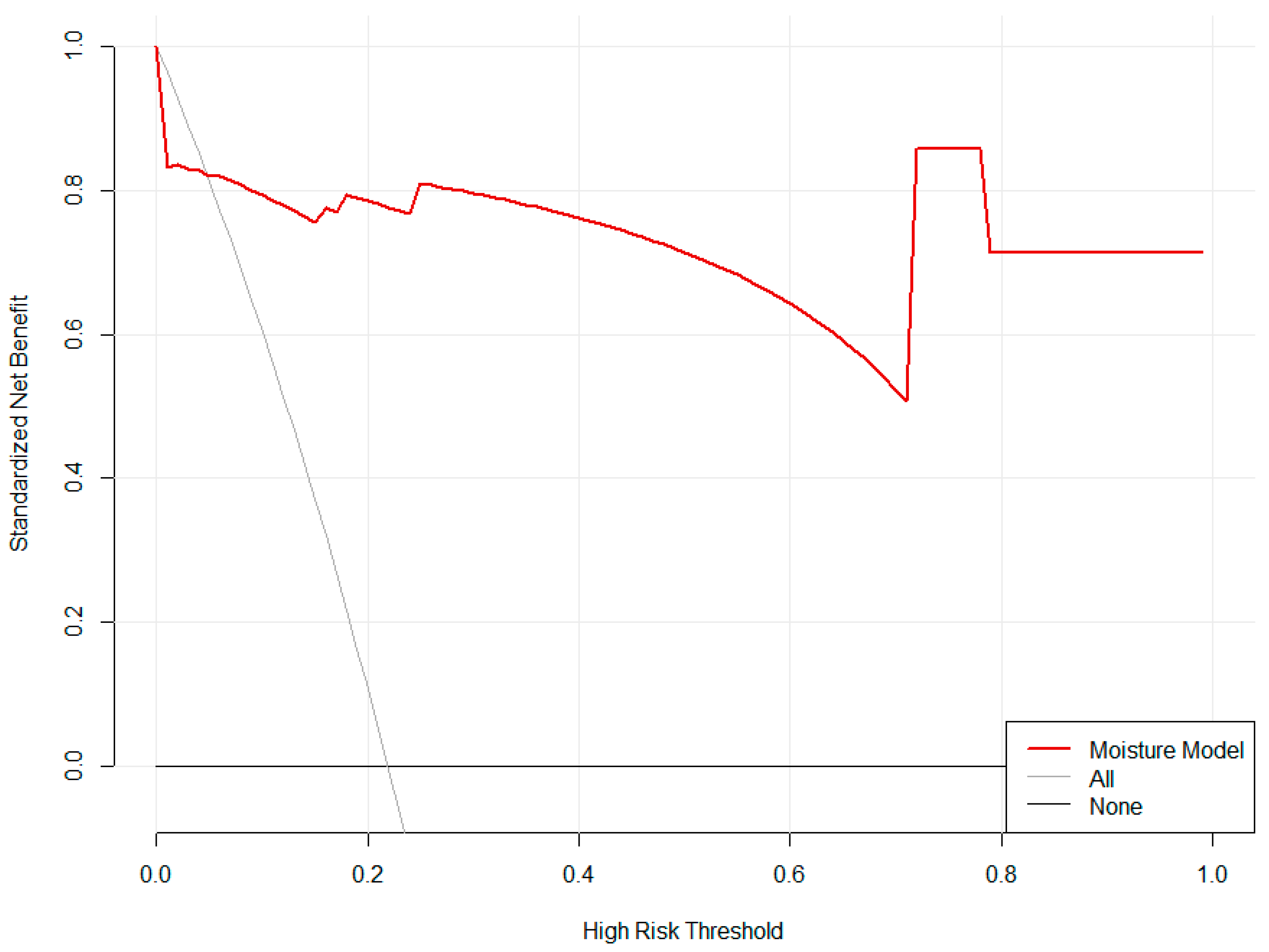 Decision Curve Analysis revealed that the ‘Moisture Model’ strategy provided a superior net benefit compared to default strategies across most threshold probabilities (approximately 0.1 to 0.9), demonstrating its practical utility for informing classification decisions (