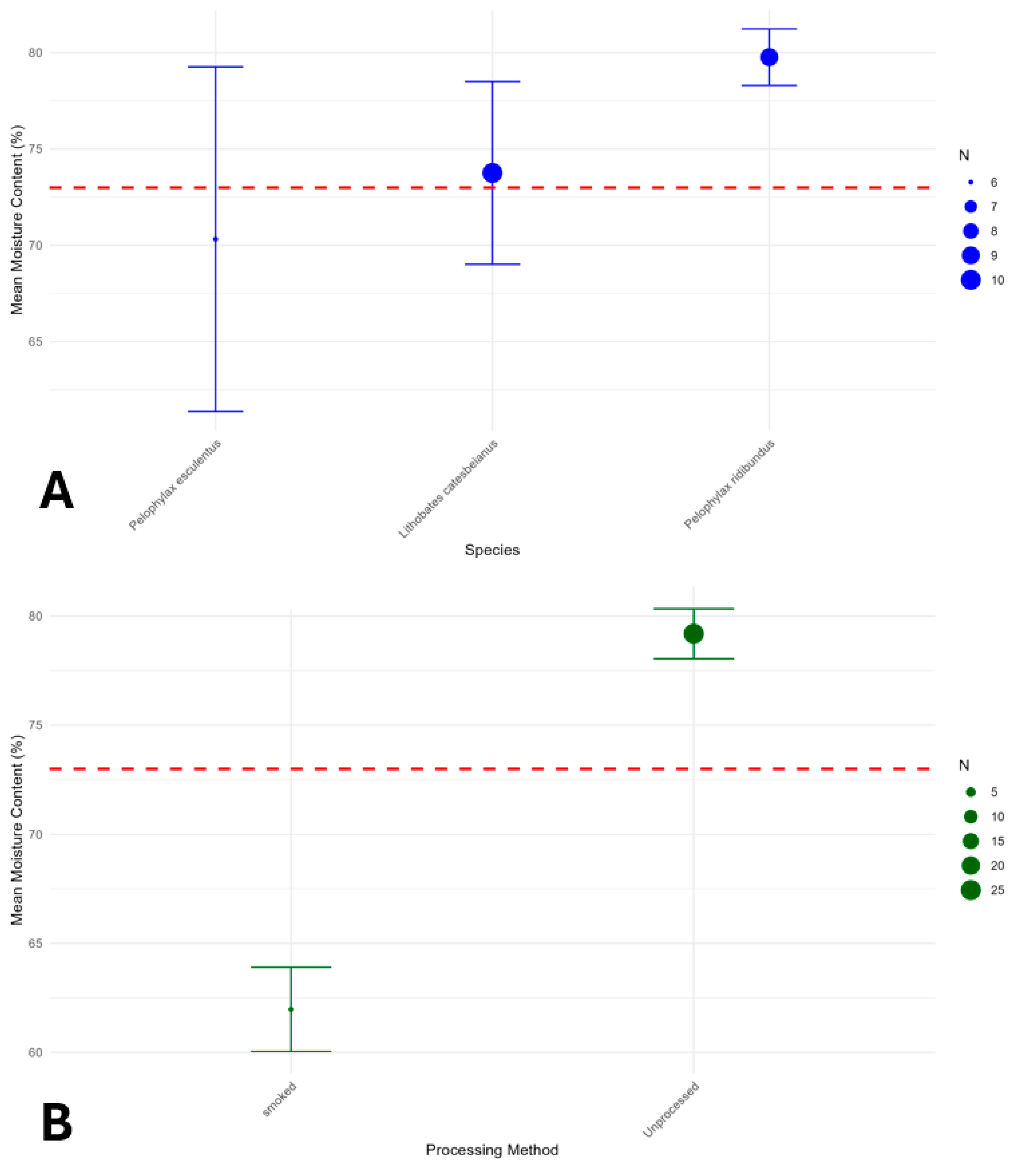 Dicroglossus occipitalis, have consistently reported high moisture content, with raw frog legs of cultured