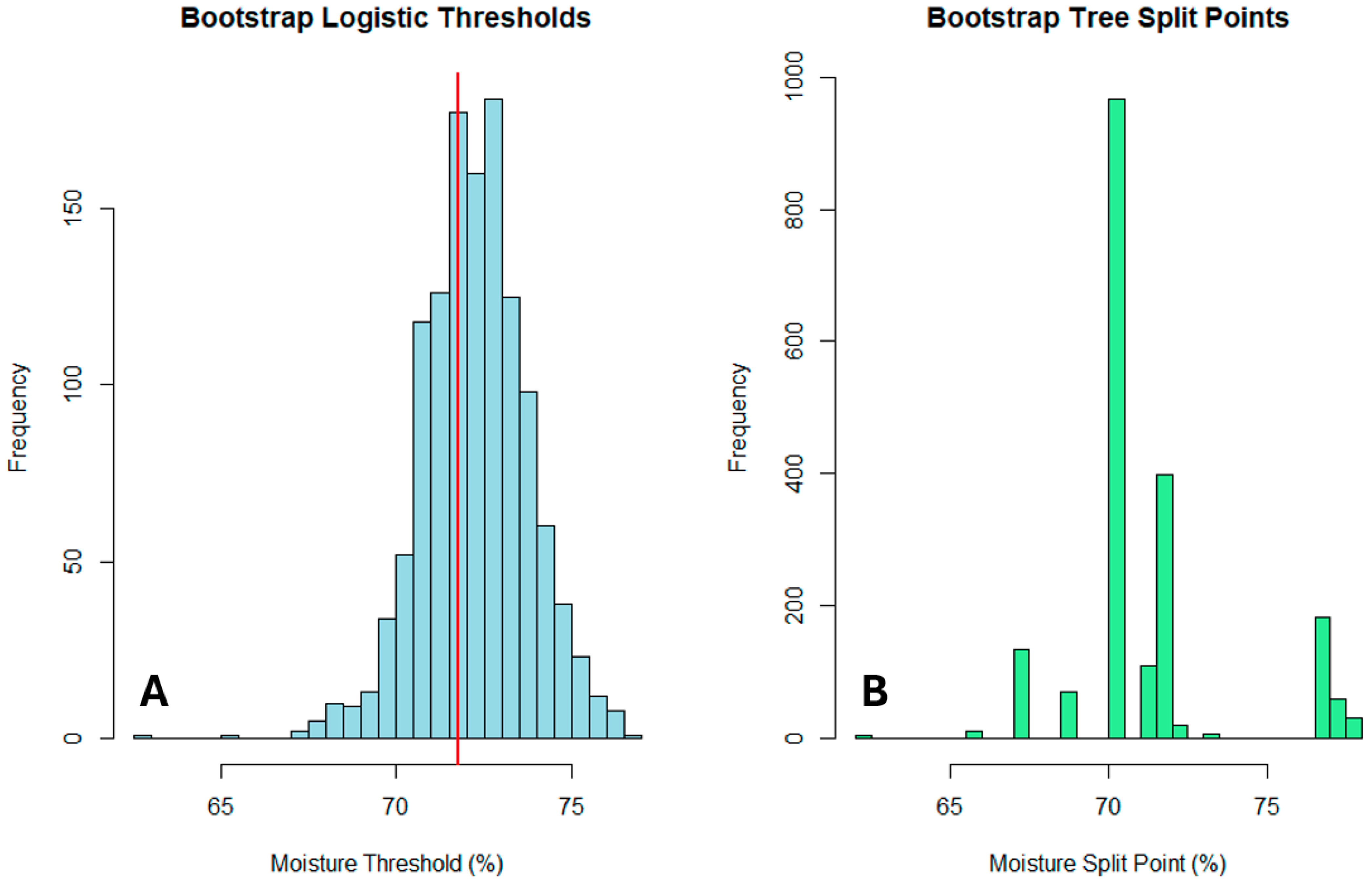 Bootstrap analysis revealed stable moisture thresholds with quantifiable uncertainty. The logistic regression 50% probability threshold was estimated at 71.75% (95% BCa CI: 67.45–74.08%), while the decision tree split point was 70.40% (95% BCa CI: 62.01–71.62%). The high proportion of valid bootstrap samples (62.7% for logistic regression, 99.9% for decision trees) indicated good estimation stability, with the decision tree threshold showing particularly high reproducibility (99.9% valid samples;