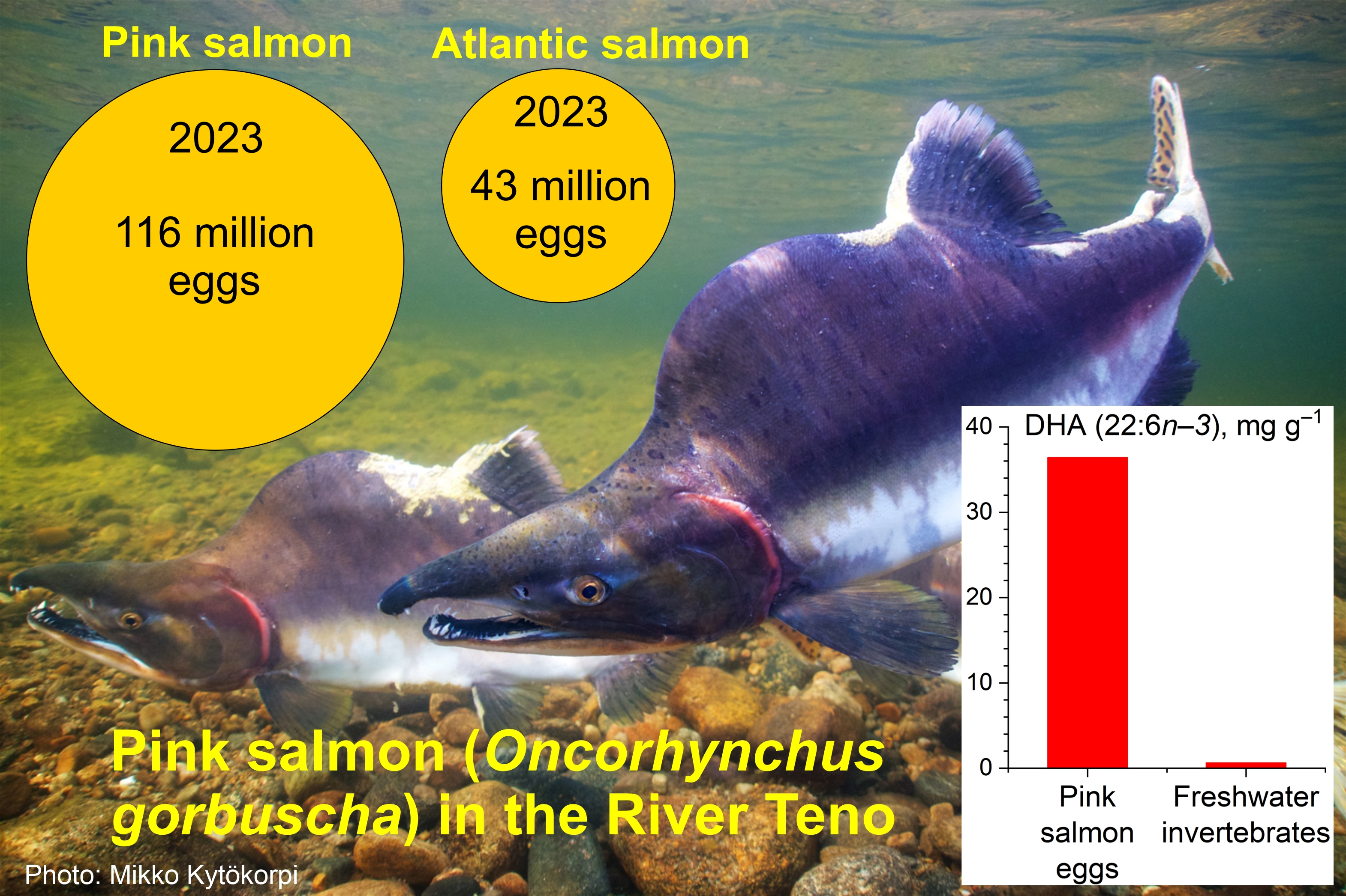 . The parr phase of Atlantic salmon, which lasts for several years in the river, is absent in pink salmon. The feeding migration of Atlantic salmon from post-smolt to adult in the sea can take several years, but the feeding migration of pink salmon from post-smolt to adult takes a little over a year. The total life cycle of a salmon is 4–10 years and that of pink salmon is 2 years. (Photos: Mikko Kytökorpi, Ari Savikko, Ville Vähä, and Pekka J. Vuorinen).