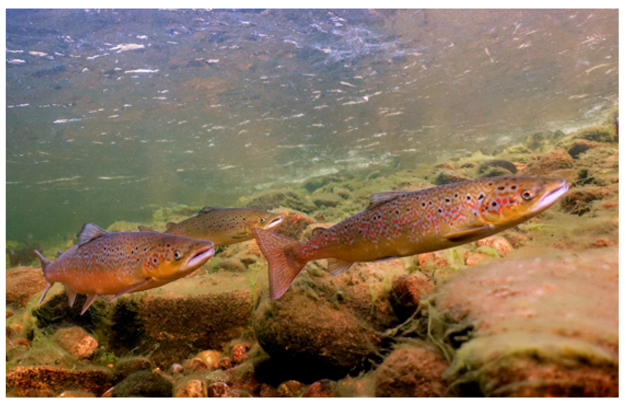 - Honda, K.; Hasegawa, K.; Ban, M.; Yano, Y.; Ogura, Y. Massive stocking of chum salmon (Oncorhynchus keta) fry fattens non-native brown trout (Salmo trutta) in Hokkaido, Japan. PLoS ONE 2024, 19, e0307552. [Google Scholar] [CrossRef] [PubMed]