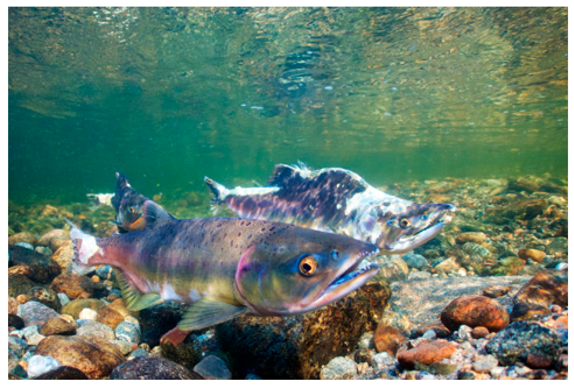 3.1. Pink Salmon Spawn Earlier than Atlantic Salmon