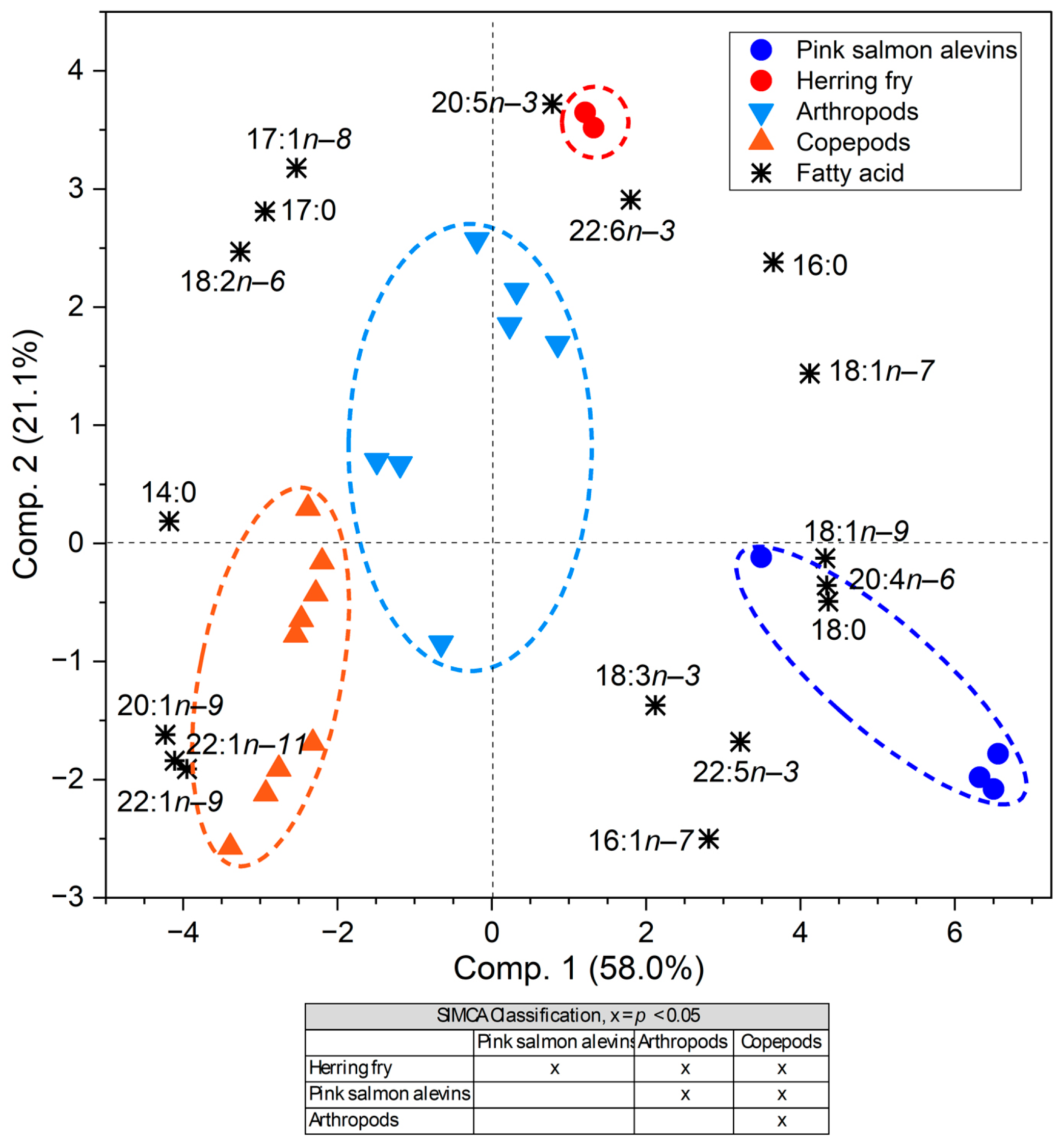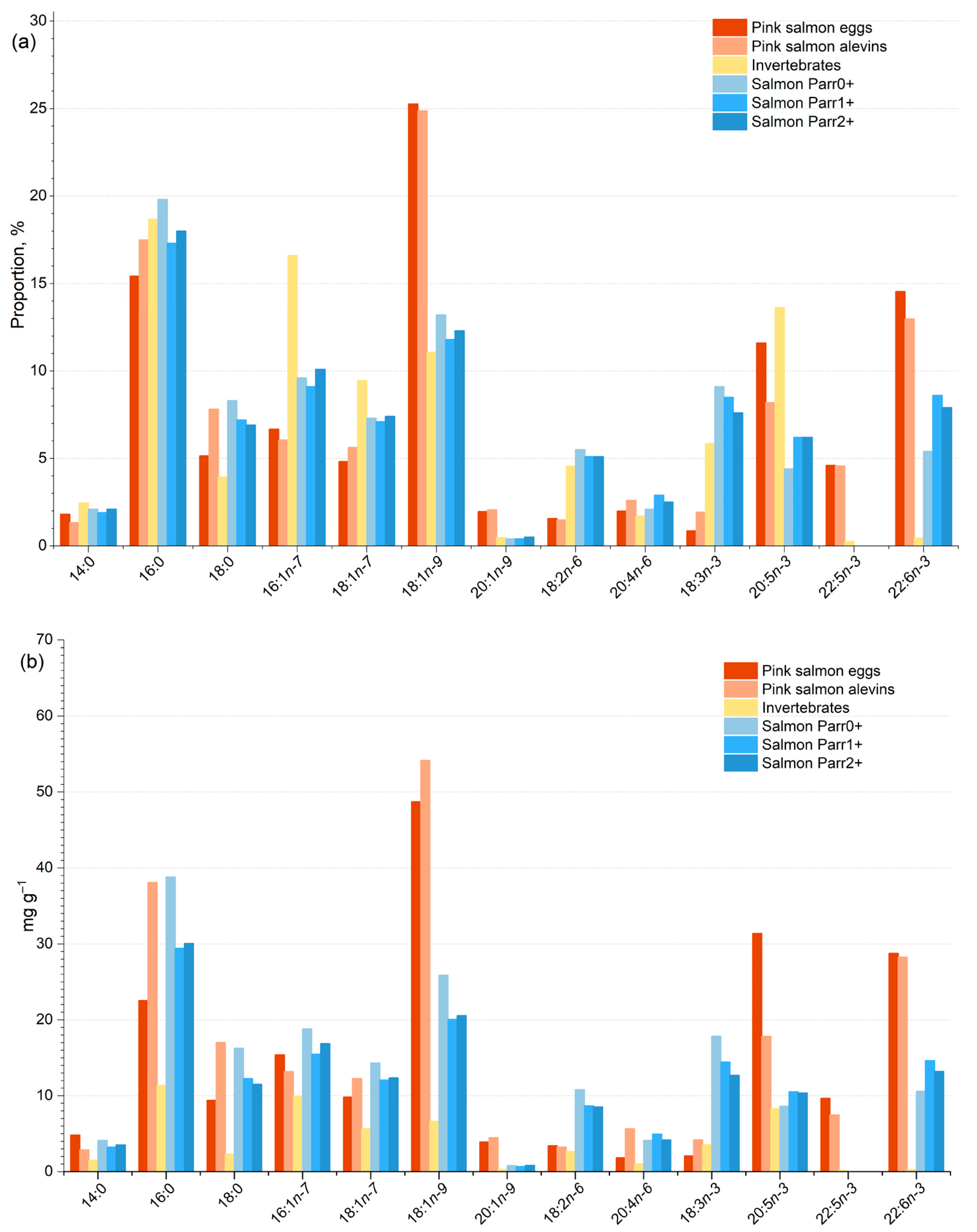 - Fokina, N.; Ruokolainen, T.; Efremov, D.; Murzina, S.A. Changes in the composition of lipids and their fatty acids in pink salmon, Oncorhynchus gorbuscha, during the spawning migration. Environ. Biol. Fishes 2025, 108, 109–130. [Google Scholar] [CrossRef]