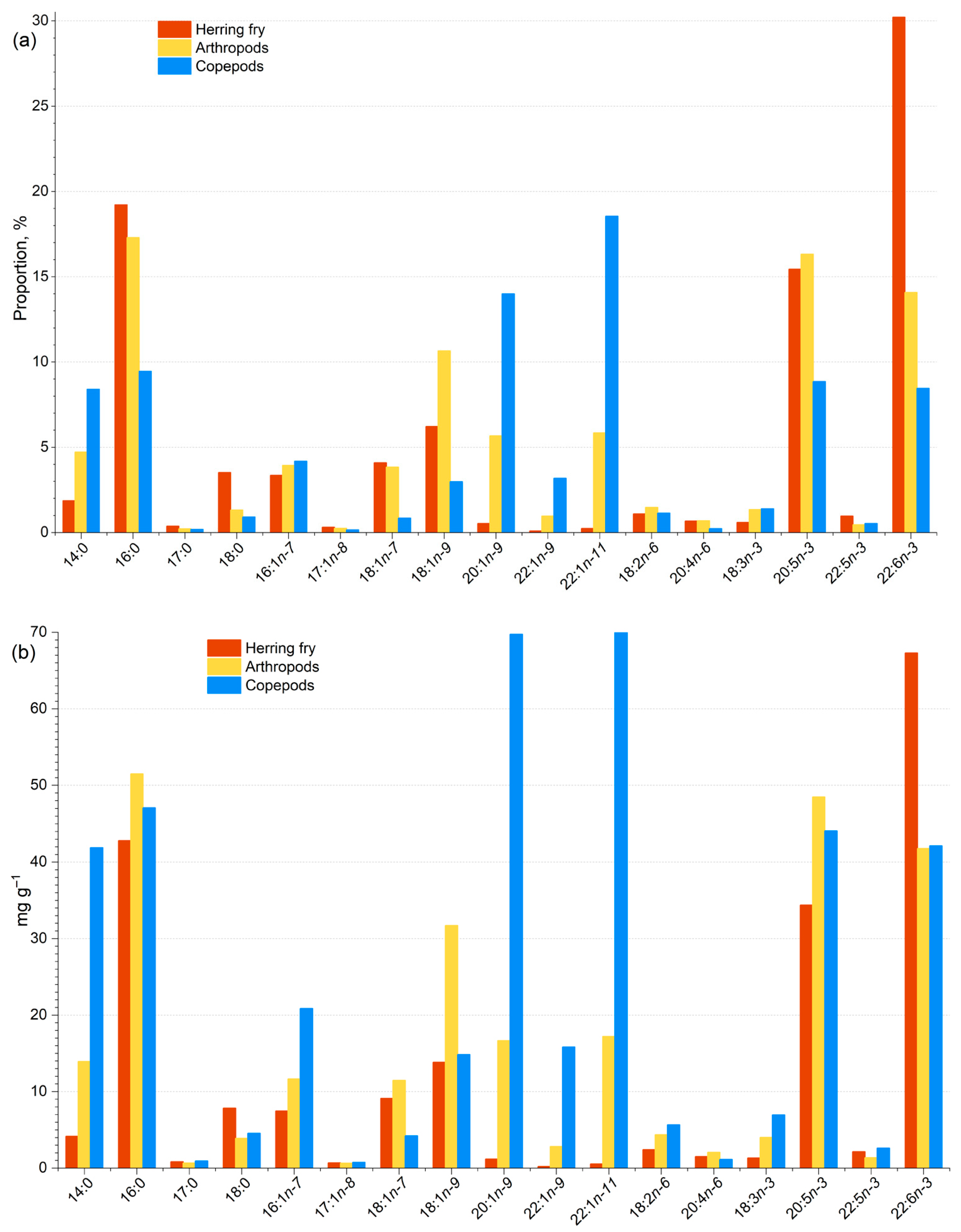 - Iverson, S.J.; Frost, K.J.; Lang, S.L.C. Fat content and fatty acid composition of forage fish and invertebrates in Prince William Sound, Alaska, factors contributing to among and within species variability. Mar. Ecol. Prog. Ser. 2002, 241, 161–181. [Google Scholar] [CrossRef]