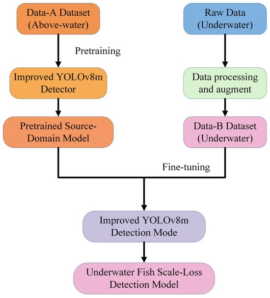 A two-stage transfer learning pipeline was established to bridge the gap between the above-water and underwater domains to address the challenges of limited underwater training samples and domain discrepancies, which often lead to slow convergence and overfitting [27,28,29]. To fully leverage source domain knowledge, the improved YOLOv8 model was first pretrained on the above water image dataset. These pretrained weights were then transferred to the underwater image dataset for fine-tuning. This approach enables knowledge acquired in the source domain to be efficiently adapted to the target domain, thereby enhancing detection performance under low data regimes in underwater environments.