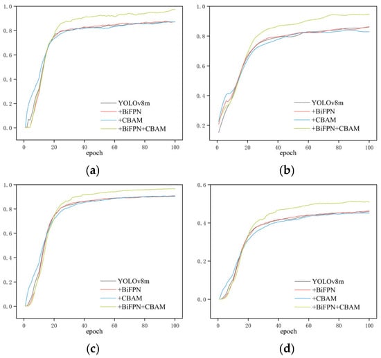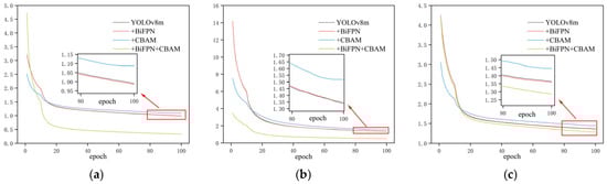 To assess the individual contributions of the proposed modules to detection performance, four groups of ablation studies were conducted: the baseline YOLOv8m, the model with BiFPN only, the model incorporating only CBAM, and the combined model integrating both BiFPN and CBAM. All models were trained and evaluated using identical datasets and training conditions to ensure fairness. The training loss curves and performance metric curves are shown in Figure 8 and Figure 9, respectively, while the detailed quantitative results are summarized in Table 2.