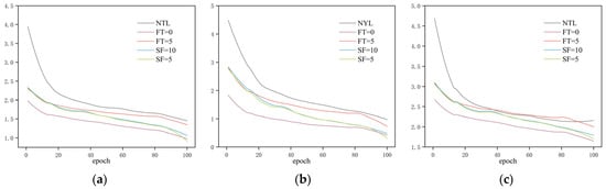 (1) No Transfer Learning (NTL): the model is trained from scratch without using any pretrained weights. (2) Fine-tuning = 0 (FT = 0): pretrained weights are utilized, and all network layers are fine-tuned during training. (3) Fine-tuning = 5 (FT = 5): pretrained weights are applied, with the initial part of the backbone frozen and the final five layers fine-tuned. (4) Stage-wise Freezing = 10 (SF = 10): the first ten layers of the backbone are initially frozen and progressively unfrozen during training. (5) Stage-wise Freezing = 5 (SF = 5): the first five layers of the backbone are initially frozen, followed by a staged unfreezing strategy [13,14,15,30,32].