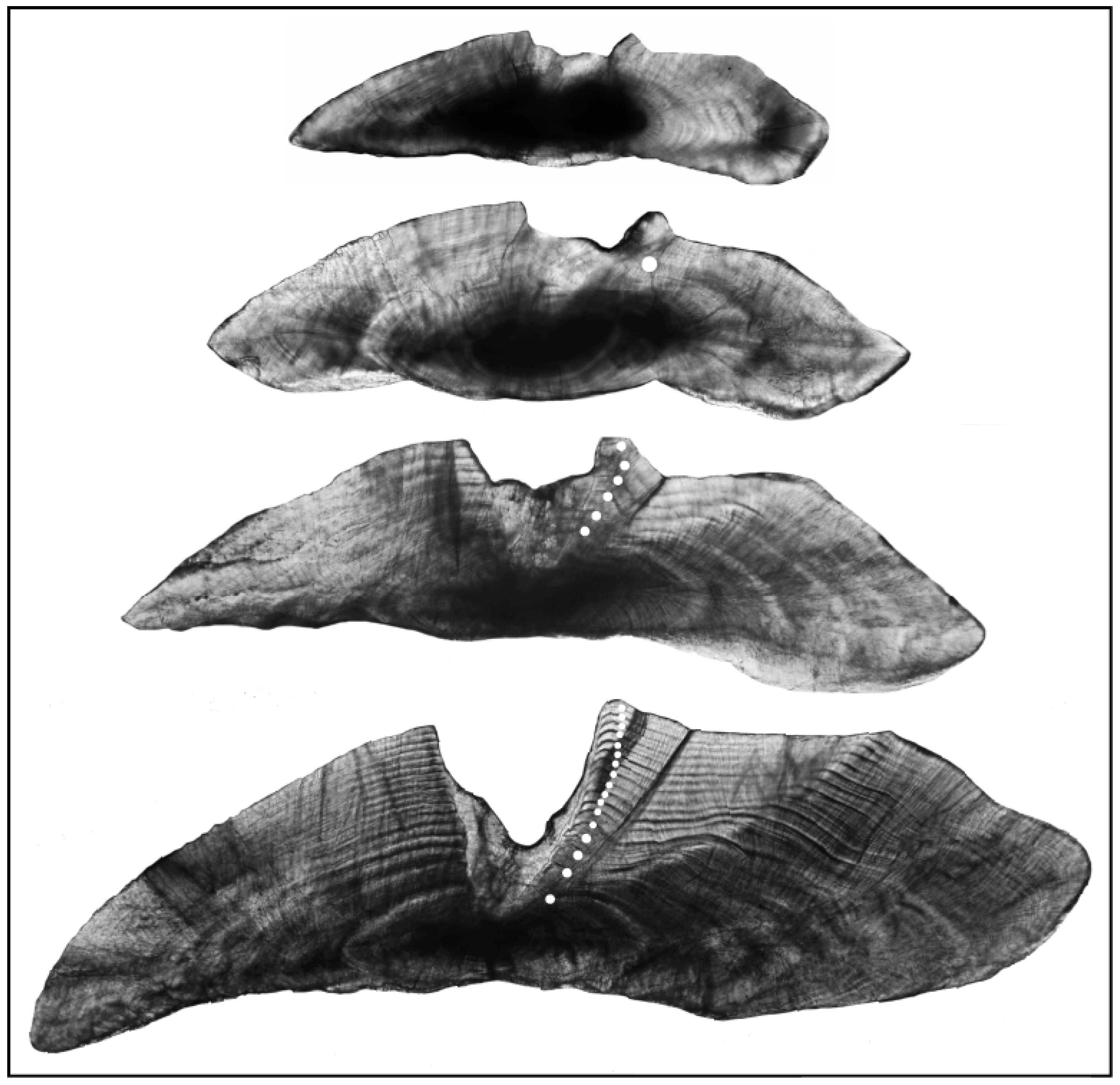 - Ogino, Y.; Furumitsu, K.; Kiriyama, T.; Yamaguchi, A. Using optimised otolith sectioning to determine the age, growth and age at sexual maturity of the herbivorous fish Kyphosus bigibbus: With a comparison to using scales. Mar. Freshw. Res 2019, 71, 855–867. [Google Scholar] [CrossRef]
