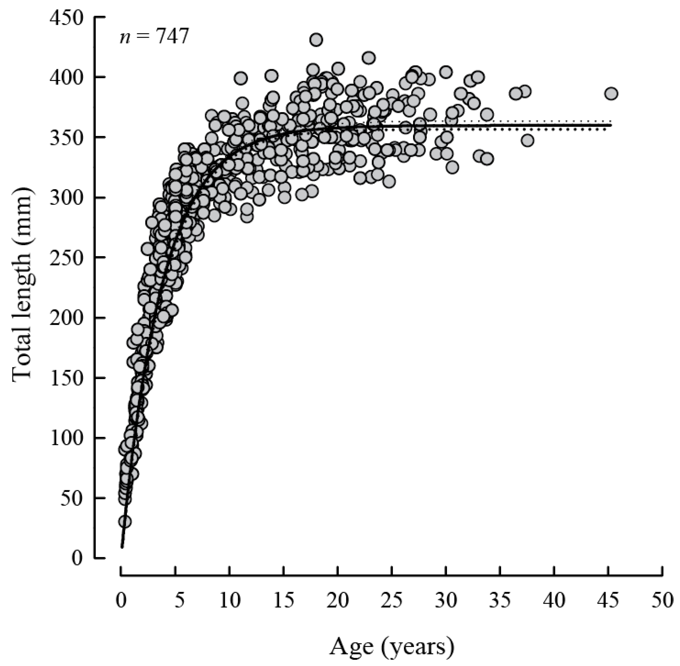 - Cerrato, R.M. Interpretable statistical tests for growth comparisons using parameters in the von Bertalanffy equation. Can. J. Fish. Aquat. Sci. 1990, 47, 1416–1426. [Google Scholar] [CrossRef]