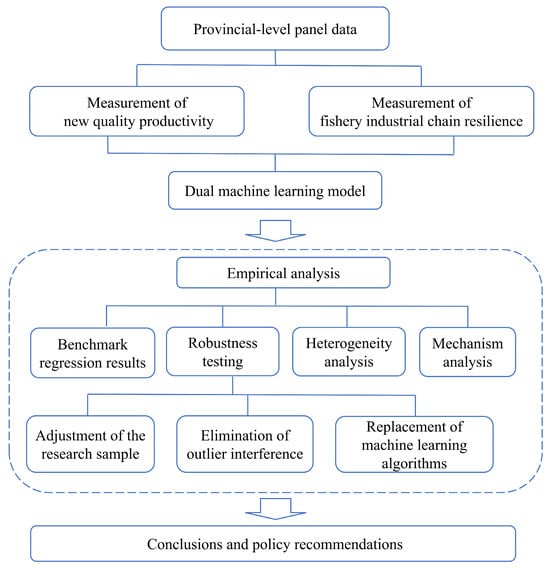 Following the introduction, Section 2 reviews the related literature and conceptualizes the impact pathways between NQP and FCR. Section 3 describes the construction of the analytical framework, including the measurement of key variables, the methodological approach, and the data sources. Section 4 reports the empirical results, while Section 5 concludes with the main findings and policy implications. Figure 1 illustrates the overall workflow of this study. The analytical process begins with provincial-level panel data, which are used to construct the independence variable (NQP) and the dependent variable (fishery industry chain resilience). These measurements are then incorporated into a dual machine learning framework to conduct empirical analyses, including benchmark regression, robustness testing, heterogeneity analysis, and mechanism analysis. The process concludes with the derivation of research conclusions and corresponding policy recommendations.