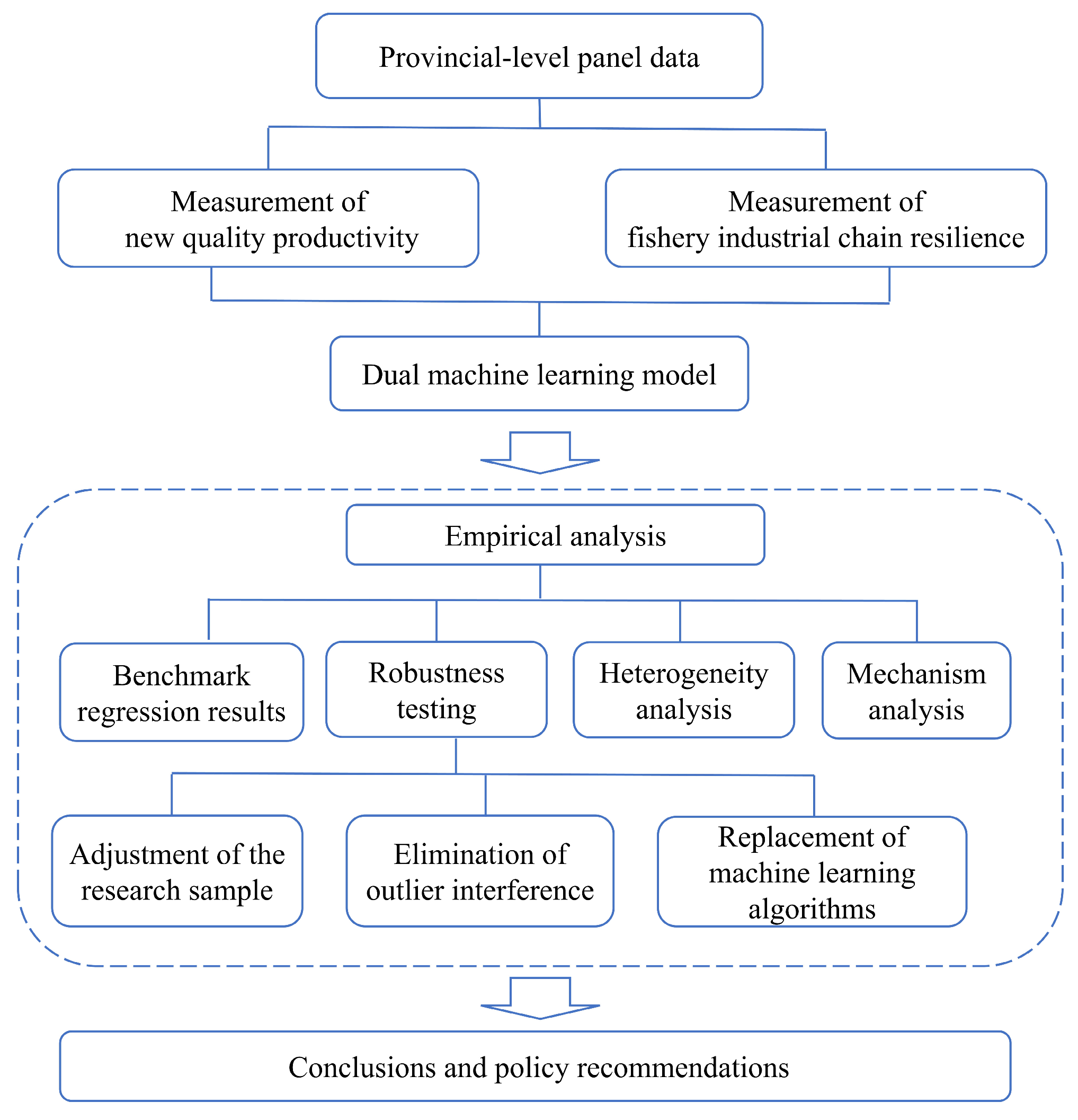 Although substantial research has examined both fishery industry chain resilience (FCR) and NQP, relatively few studies have integrated these two perspectives within a unified analytical framework. To address this gap, this study investigates 29 Chinese provinces (excluding Tibet, Hong Kong, Macao, Taiwan, and Qinghai) from 2012 to 2022, measuring provincial-level FCR and analyzing the heterogeneous effects of NQP across regions. The potential contributions of this paper are threefold. First, by quantitatively assessing provincial FCR and incorporating new quality productivity into the analytical framework, we construct a research system that combines theoretical logic with empirical testing, thereby systematically revealing the role of new quality productivity in strengthening industry chain resilience. Second, from the perspective of improving labor productivity, we examine the transmission mechanisms through which NQP enhances FCR, offering a valuable extension to the existing literature. Finally, by employing a dual machine learning model, we leverage the advantages of machine learning algorithms in handling high-dimensional and non-parametric prediction problems. This approach alleviates the challenges of dimensionality and model bias inherent in traditional econometric models, thereby improving the robustness and credibility of the results.