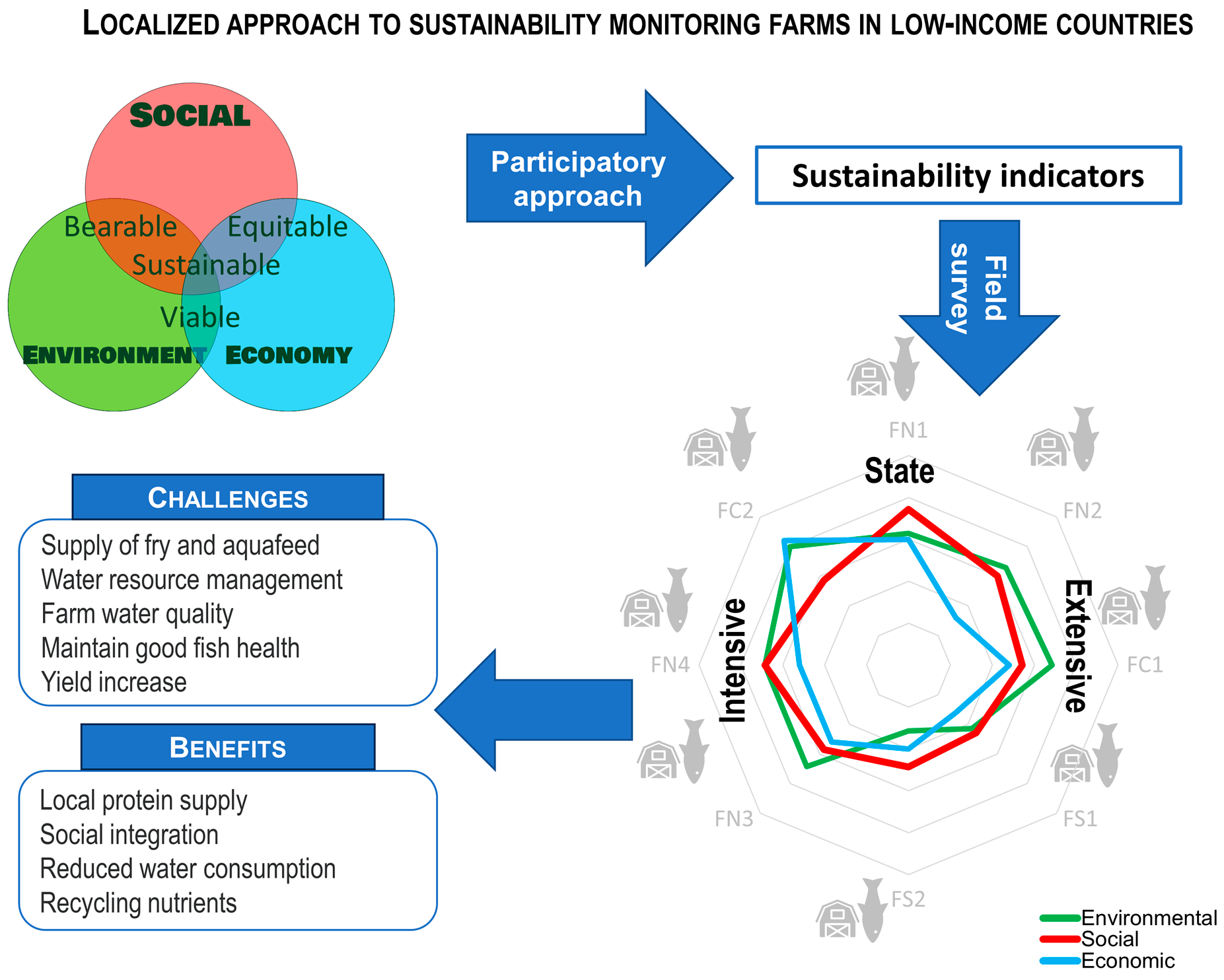- Economic (5 indicators): Funding and Autonomy, Sales strategy, Diversity of farm products, Job-producing efficiency (ton per job), and Risk prevention and management system.