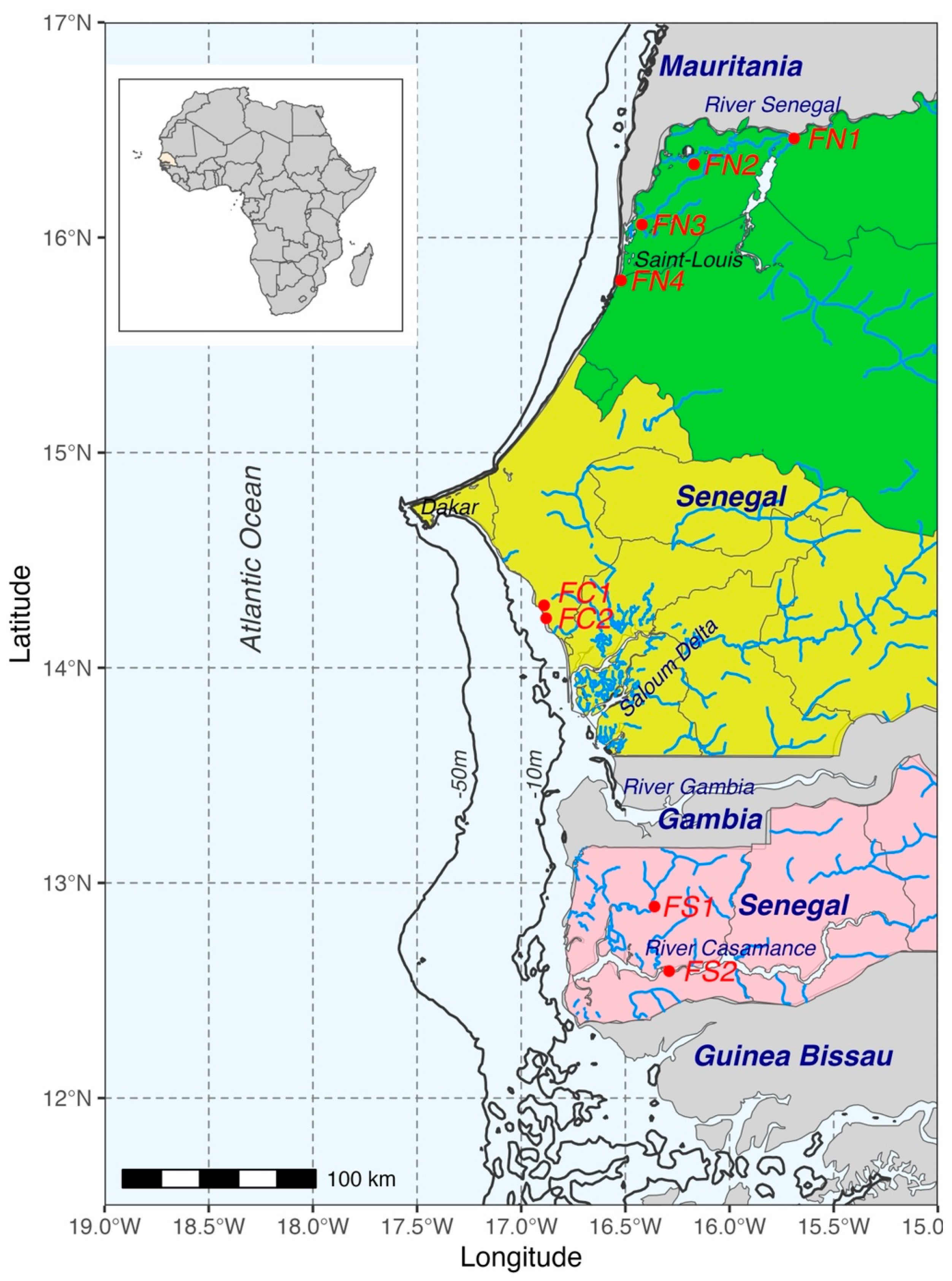 - Diallo, A.; Diouf, P.S.; Ngom, M.; Ndiaye, V. L’Aquaculture (Pisciculture et Crevetticulture) Dans la Vallée du Fleuve Sénégal: Potentialité et Perspective. 2003. Available online: https://www.sidalc.net/search/Record/dig-aquadocs-1834-2222 (accessed on 22 April 2024).