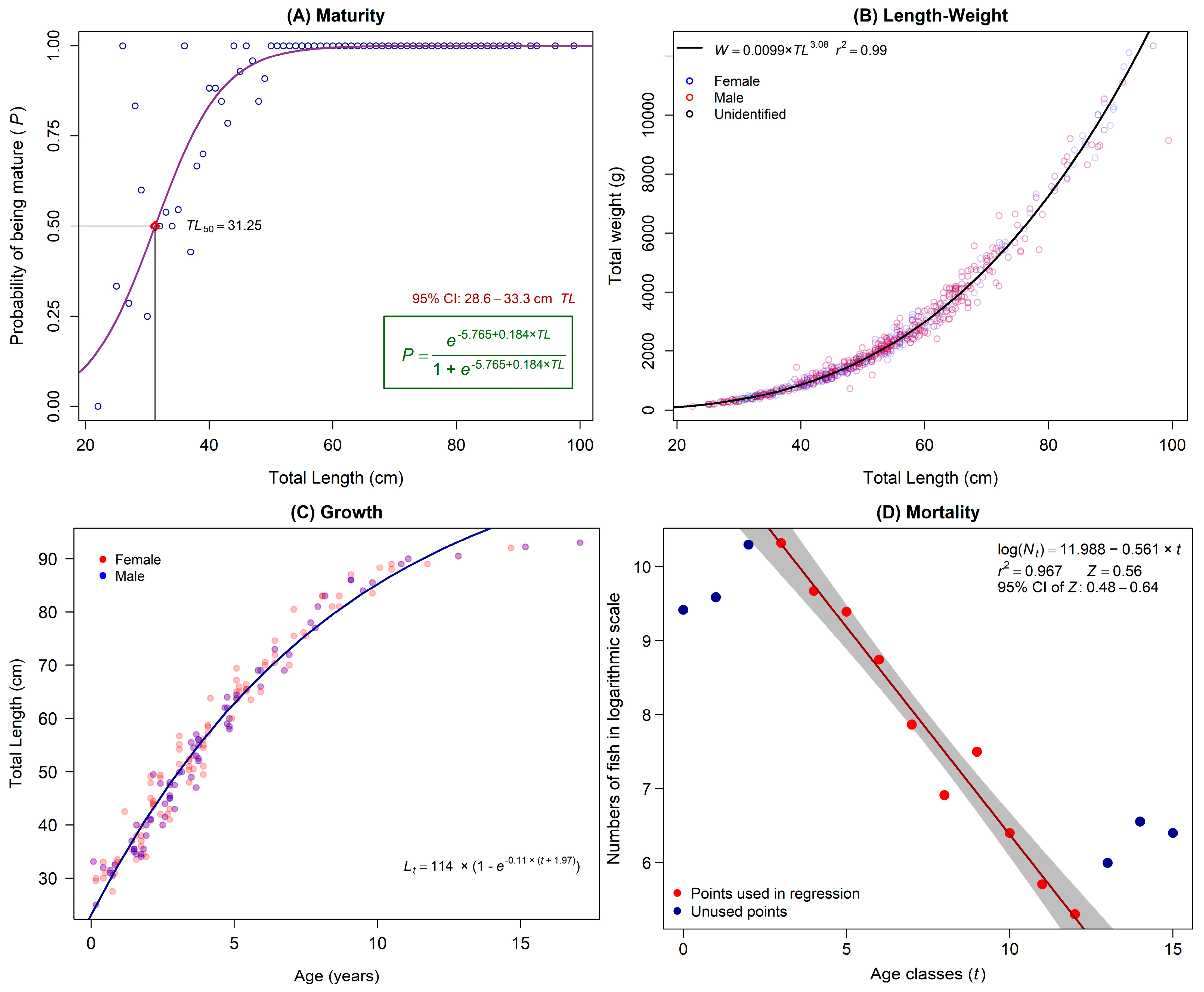 - Roa, R.; Ernst, B.; Tapia, F. Estimation of size at sexual maturity: An evaluation of analytical and resampling procedures. Fish. Bull. 1999, 97, 570–580. [Google Scholar]