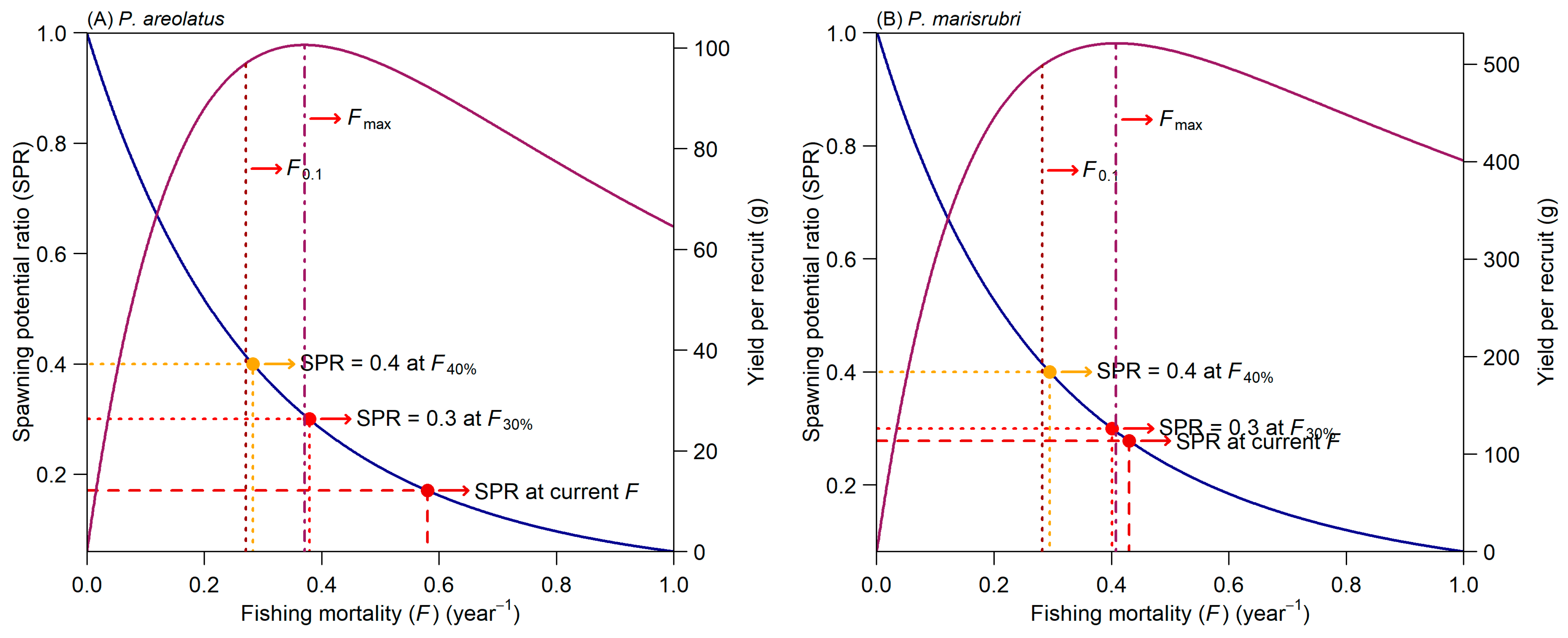 - Goodyear, C.P. Spawning stock biomass per recruit in fisheries management: Foundation and current use. Can. Spec. Publ. Fish. Aquat. Sci. 1993, 120, 67–82. [Google Scholar]