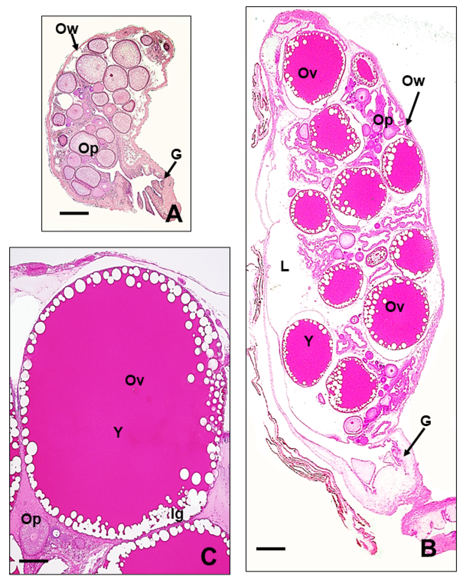 - Grier, H.J.; Uribe, M.C.; Patiño, R. Chapter 2. The ovary, folliculogenesis and oogenesis in teleosts. In Reproductive Biology and Phylogeny of Fish (Agnatha and Bony Fishes); Jamieson, B.G.M., Ed.; Science Publishers, Inc.: Enfield, NH, USA; Plymouth, UK, 2009; pp. 25–84. [Google Scholar]